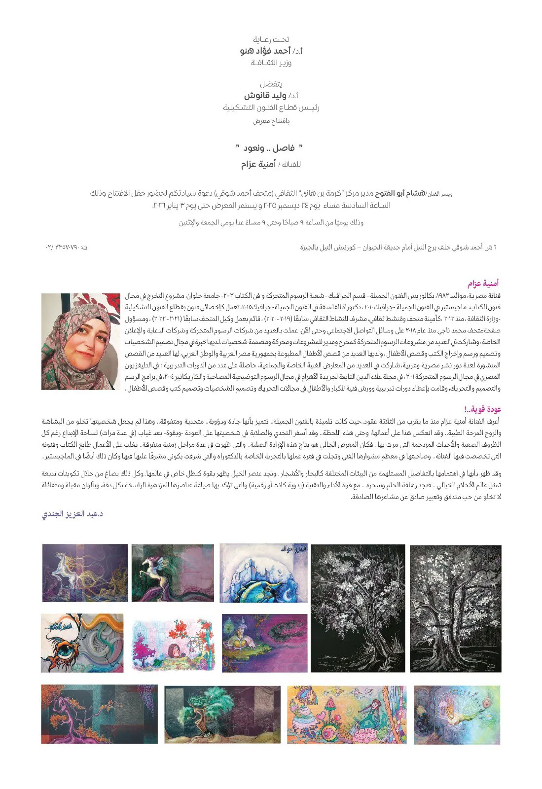 فاصل.. ونعود» مع الفنانة د. أمنية عزام دعوة فنية استثنائية برعاية أ.د/ أحمد فؤاد هنو وزير الثقافة يتشرف أ.د/ وليد قانوش رئيس قطاع الفنون التشكيلية بافتتاح معرض الفنانة د/ أمنية عزام. في الـ 6 مساء يوم الأربعاء 24 ديسمبر 2025 بمركز كرمة بن هانئ الثقافي بمتحف أحمد شوقي. تأخذنا الفنانة د. أمنية عزام في رحلة بصرية داخل عالمها الفني في معرضها الجديد. ويستمر العرض حتى 3 يناير 2026، يوميًا من 9 صباحًا حتى 9 مساءً (عدا الجمعة والاثنين) لا تفوّتوا فرصة حضور المعرض (الدخول مجاناً). دايماً سعداء بوجودكم #قطاع_الفنون_التشكيلية