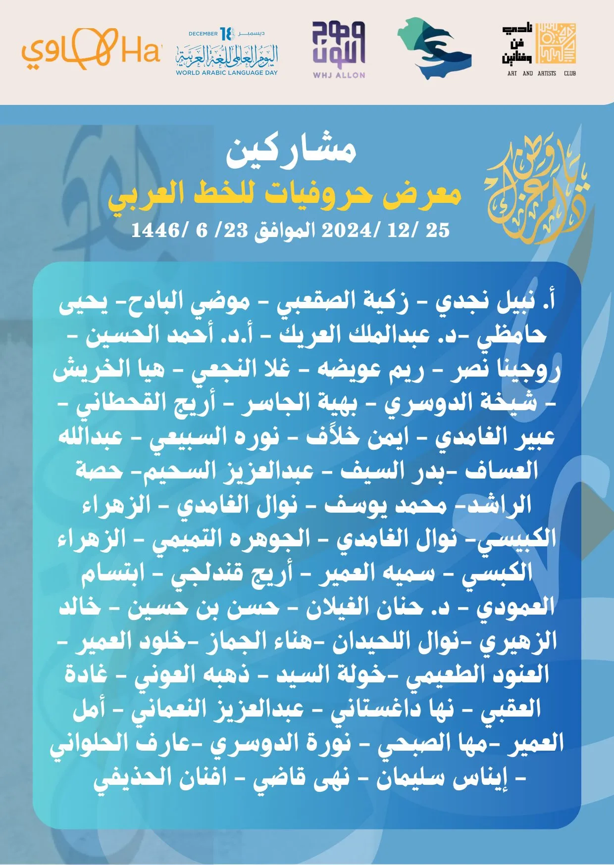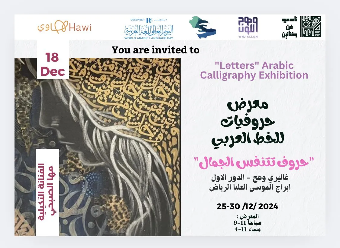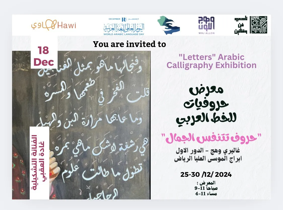 إحتفالاً بجمال لغتنا العربية، يسرنادي فن وفنانين بالتعاون مع غاليري وهج اللون دعوتكم لحضور إفتتاح معرض معرض حروفيات الخط العربي برعاية كريمة من رجل الأعمال والباحث في فلسفة الخط العربي والفنان التشكيلي الأستاذ محمد العجلان وذلك يوم الأربعاء الموافق 25 ديسمبر 2024 في تمام الساعة السابعة مساء سيكون هذا المعرض فرصة استثنائية لاستكشاف قدرة الفنان على التعامل مع الحرف العربي وفلسفته الفريدة، وفرصة تواصل نوعية لعشاق الخط العربي والفنون التشكيلية. . حضوركم يشرفنا ويثري الحدث . المكان : غاليري وهج اللون