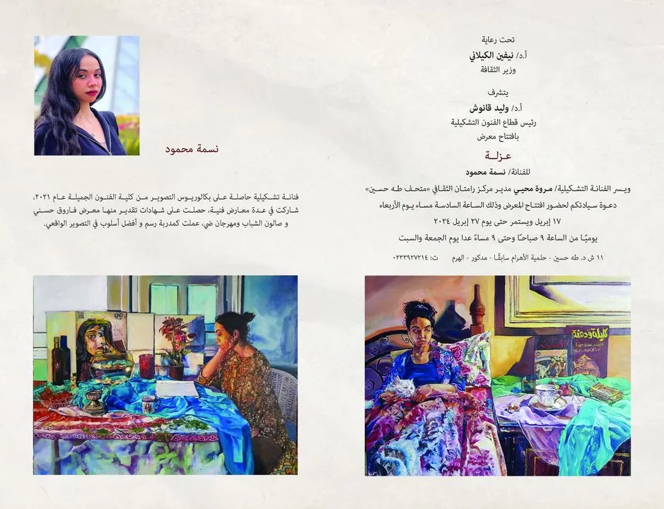 عزلة بمركز رامتان الثقافي برعاية أ.د/ نيفين الكيلاني وزيرة الثقافة يتفضل أ.د/ وليد قانوش رئيس قطاع الفنون التشكيلية بافتتاح معرض الفنانة/ نسمة محمود تحت عنوان (عزلة) وذلك في تمام الساعة الـ 6 من مساء يوم الاربعاء الموافق 17 إبريل 2024 بمركز رامتان الثقافي بمتحف طه حسين. يستمر المعرض حتى يوم 27 إبريل 2024. العنوان: 1 ش د طه حسين – حلمية الأهرام سابقاً – مدكور – الهرم. المواعيد: يومياً من الساعة 9 صباحاً : الساعة 9 مساءً عدا يوم الجمعة. ت: 0233927214 #قطاع_الفنون_التشكيلية مركز رامتان الثقافي متحف طه حسين في انتظار تشريفكم