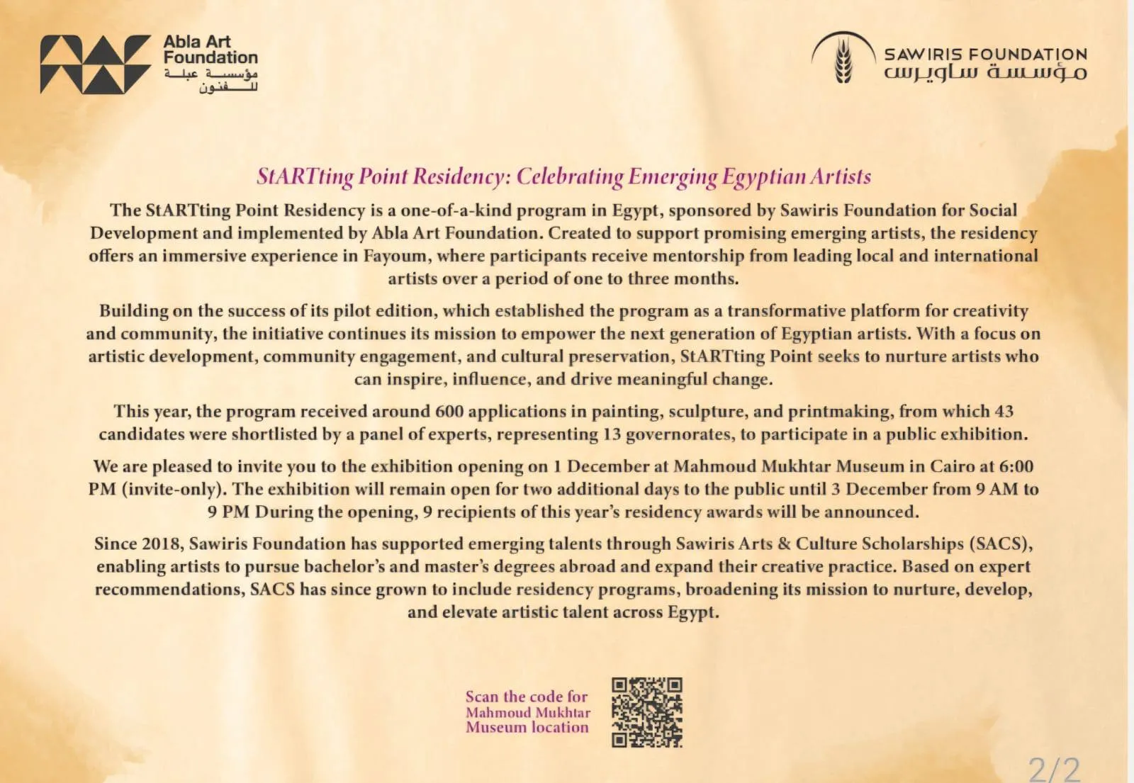 "نقطة انطلاق" من متحف محمود مختار احتفالية متميزة وحفل ساهر بحضور الأستاذ الدكتور وليد قانوش رئيس قطاع الفنون التشكيلية وبمشاركة نخبة من الفنانين تم افتتاح معرض برنامج الإقامة الفنية نقطة انطلاق StARTing Point. بتعاون مثمر مع مؤسسة عبلة للفنون، بدعم من مؤسسة ساويرس للتنمية الاجتماعية. منح الفرصة للفنانين والفنانات لعرض إبداعاتهم الفنية بجانب تكريم الفنانين المختارين للحصول على الإقامات الفنية الممولة بالكامل بقرية تونس في الفيوم، وذلك في مجالات التصوير (الرسم) والنحت والطباعة. يوم الاثنين 1 ديسمبر 2025. المكان: متحف محمود مختار Mahmoud Mokhtar Cultural Center #قطاع_الفنون_التشكيلية