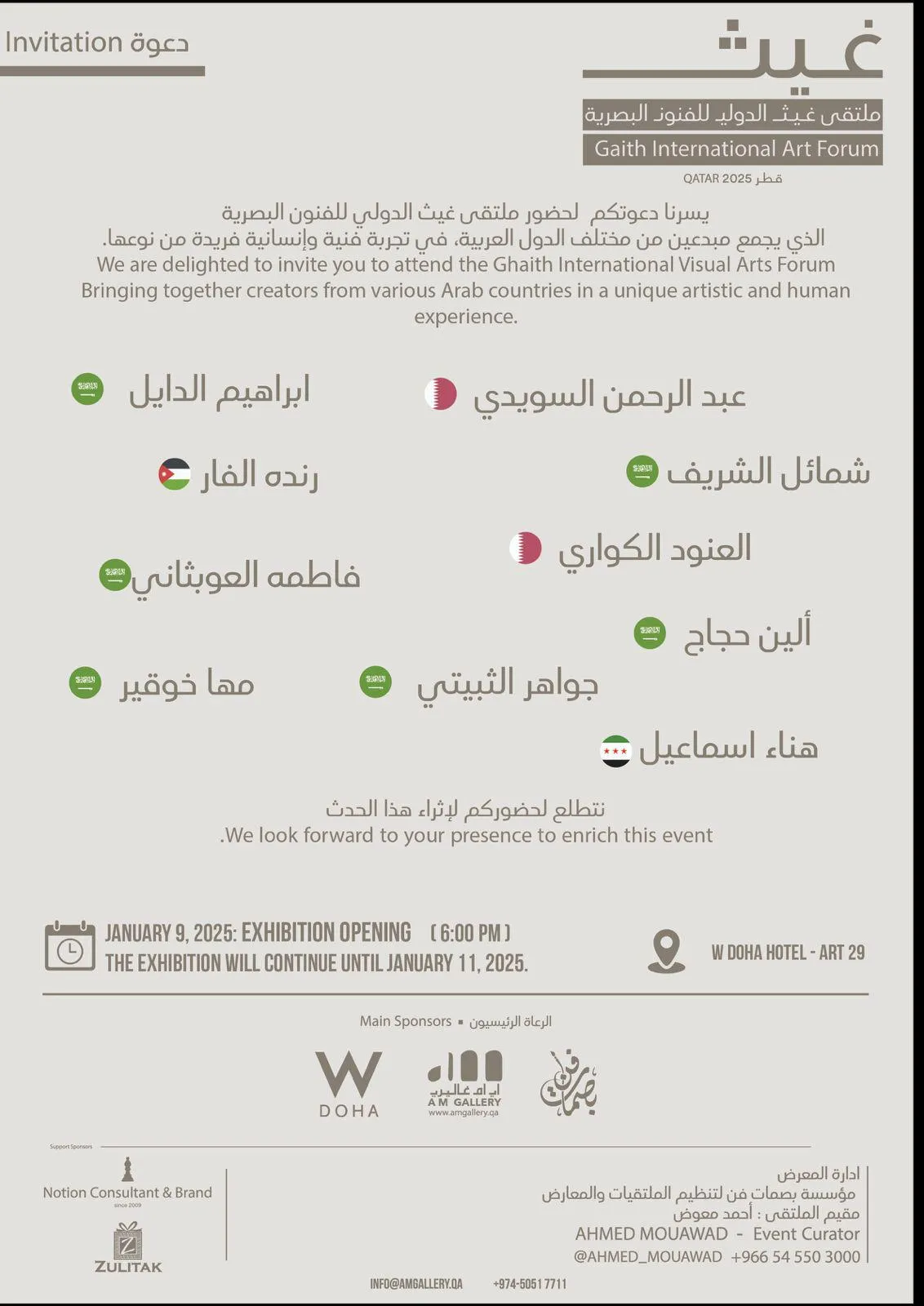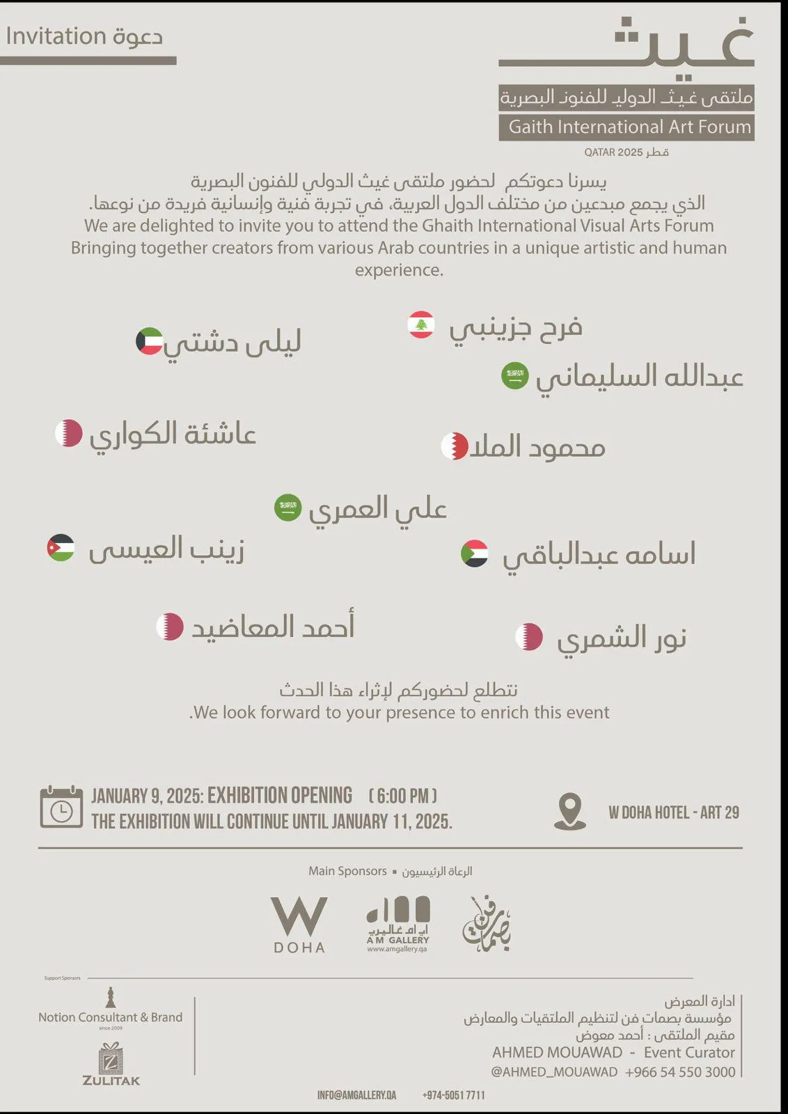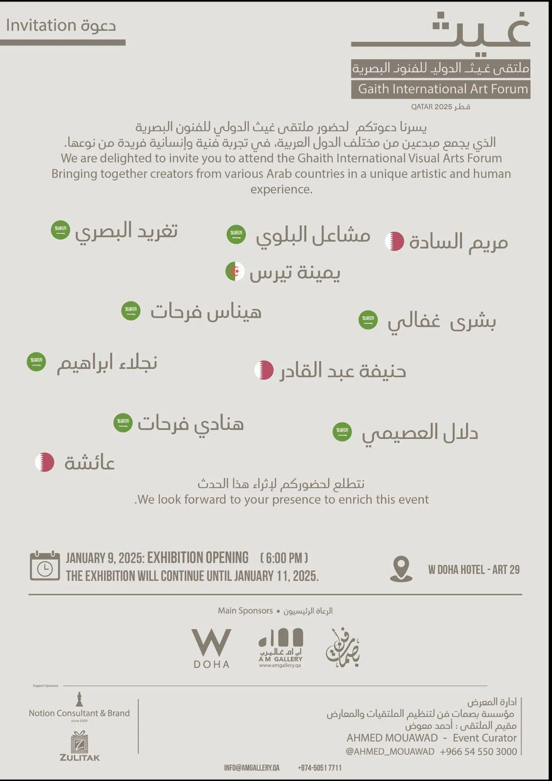 كونوا جزءًا من تجربة فنية حقيقية يسرنا دعوتكم لحضور ملتقى غيث الدولي للفنون البصرية الذي سيجمع مبدعين من مختلف الدول العربية، في تجربة فنية وإنسانية فريدة من نوعها. الفن بوابة للتواصل الثقافي انضموا إلى ملتقى غيث الدولي واستمتعوا بأعمال مميزة وجلسات حوارية تفاعلية. القيم الإنسانية و التبادل الثقافي من خلال الفنون والابداعات المختلفة أعمال فنية ، ورش عمل ، جلسات حوارية ، تفاعل للزوار ، دعم و اكتشاف المواهب ) تنتظركم اعمال فنية اصلية بمشاعر وتجارب مختلفه نتطلع إلى حضوركم لإثراء هذا الحدث وإضافة بصمتكم الخاصة. الفنانين المشاركين
