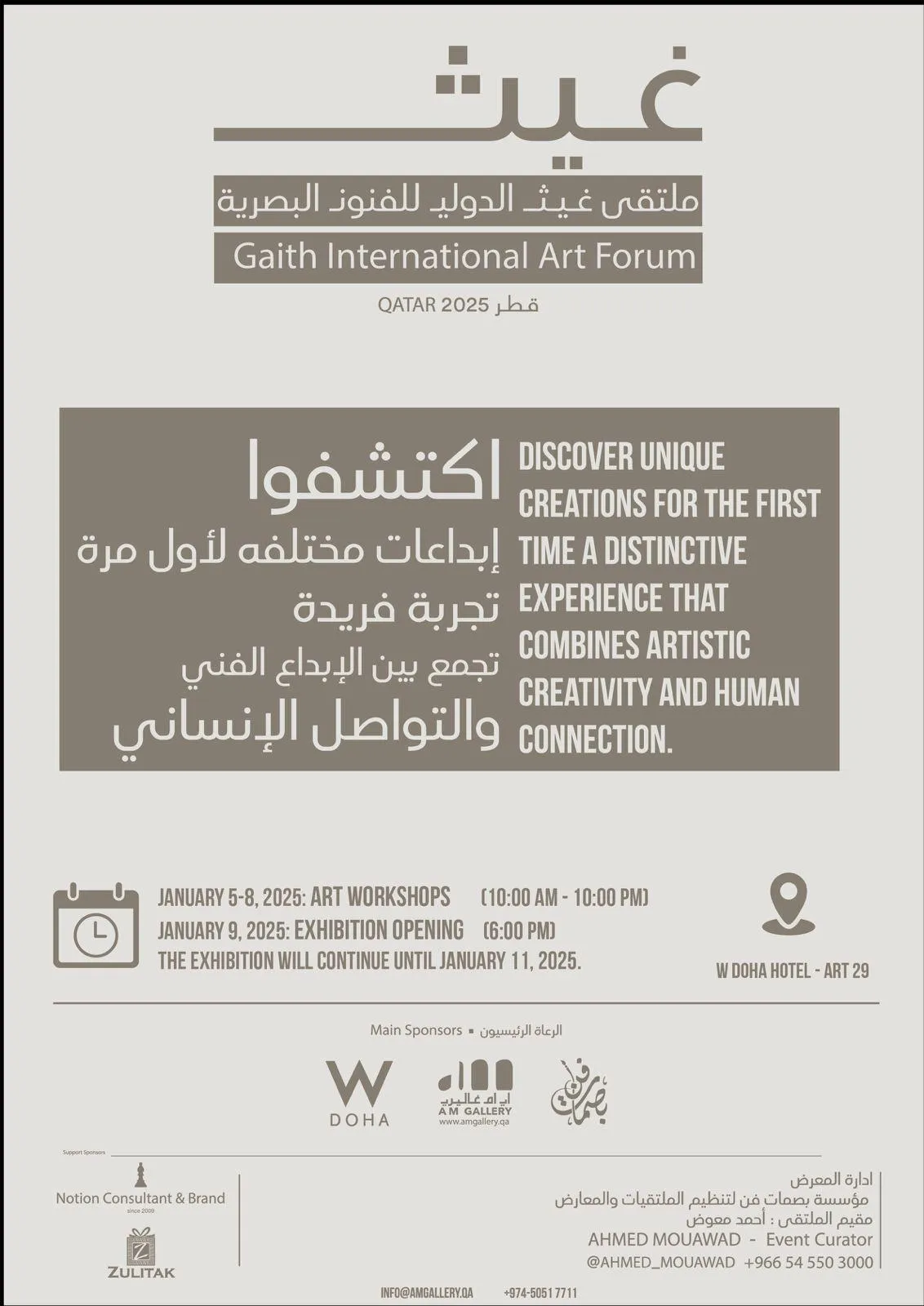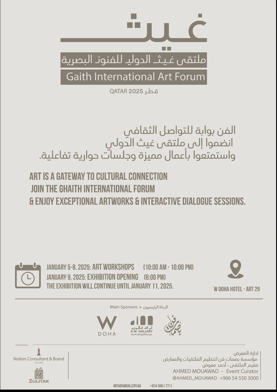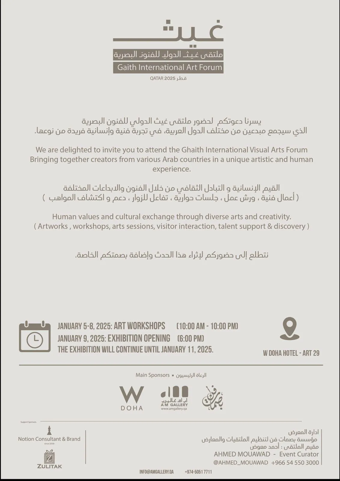 كونوا جزءًا من تجربة فنية حقيقية يسرنا دعوتكم لحضور ملتقى غيث الدولي للفنون البصرية الذي سيجمع مبدعين من مختلف الدول العربية، في تجربة فنية وإنسانية فريدة من نوعها. الفن بوابة للتواصل الثقافي انضموا إلى ملتقى غيث الدولي واستمتعوا بأعمال مميزة وجلسات حوارية تفاعلية. القيم الإنسانية و التبادل الثقافي من خلال الفنون والابداعات المختلفة أعمال فنية ، ورش عمل ، جلسات حوارية ، تفاعل للزوار ، دعم و اكتشاف المواهب ) تنتظركم اعمال فنية اصلية بمشاعر وتجارب مختلفه نتطلع إلى حضوركم لإثراء هذا الحدث وإضافة بصمتكم الخاصة. الفنانين المشاركين