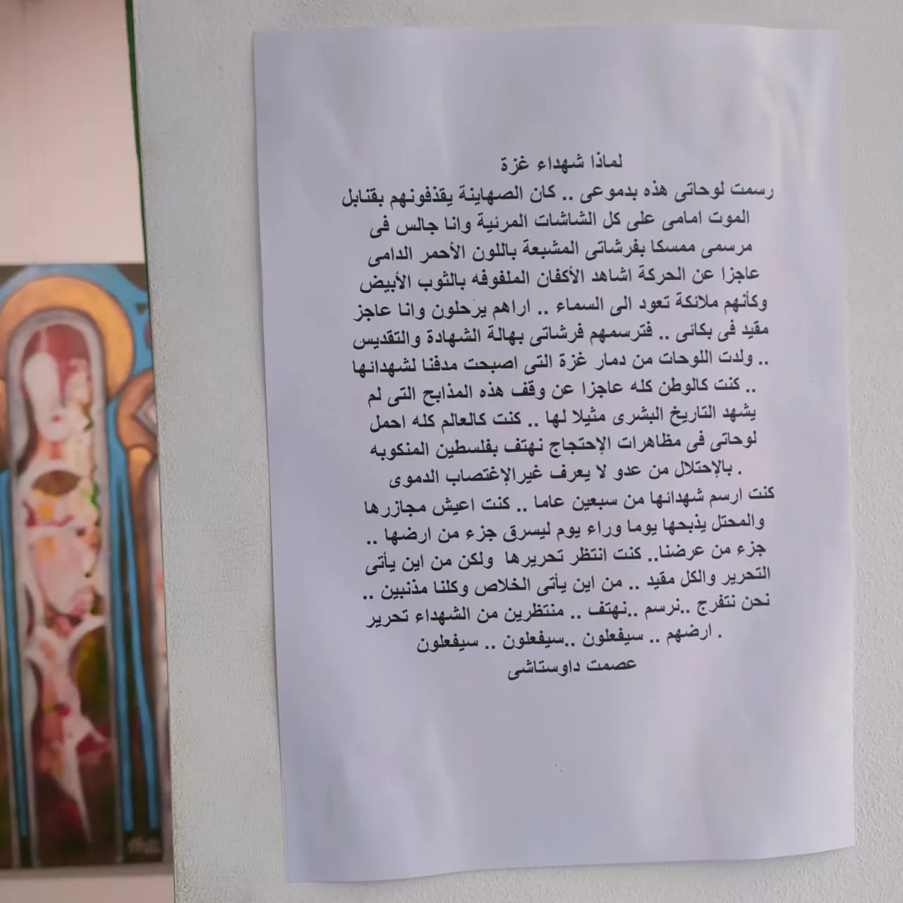 ART CORNER GALLERY معرض شهداء غزة للفنان عصمت داوستاشی يفتتح المعرض سعادة سفير سلطنة عمان الأستاذ / عبد الله ناصر الرحيى والملحق الثقافة لسفارة فلسطين ناجي الناجي يفتتح المعرض يوم الثلاثاء ٢٧ فبراير ٢٠٢٤ ويستمر حتي ١٤ مارس ٢٠٢٤ 12 Sayed ElBakry st., Zamalek, Cairo, Egypt. FB: ArtcornerZamalek Mob: 01222760212 Mzamalek.artcorner@gmail.com zamalek.artcorner