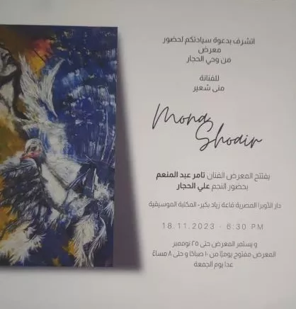 معرض من وحي الحجار للفنانة منى شعير 18 || 23 دار الاوبرا المصرية - قاعة زياد بكير المكتبة الموسيقية في تمام السادسة والنصف مساء يوم السبت الموافق ١٨ نوفمبر ۲۰۲۳ المعرض مفتوح يوميا من صباحا و حتى 4 سياء المعرض يستمر حتى يوم ٢٥ نوفمبر عدا الجمعة