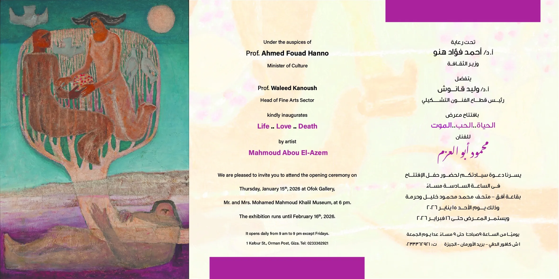 وزير الثقافة يفتتح المعرض الاستعادي للفنان الدكتور محمود أبو العزم افتتح الأستاذ الدكتور أحمد فؤاد هنو، وزير الثقافة، مساء يوم الخميس الموافق 15 يناير 2026، المعرض الاستعادي للفنان القدير الدكتور محمود أبو العزم، وذلك بقاعة (أفق 1) الكائنة بحرم متحف محمد محمود خليل وحرمه. شهدت مراسم الافتتاح حضوراً لافتاً لنخبة من رموز الفن التشكيلي، والمثقفين، والشخصيات العامة، الذين احتفوا بالمسيرة الإبداعية للفنان أبو العزم. يأتي المعرض تحت عنوان «الحياة.. الحب.. الموت»، ليقدم رؤية بصرية شاملة تلخص تجربة الفنان ومحطاته الفنية الملهمة، عاكساً فلسفته الخاصة تجاه القضايا الإنسانية الوجودية. يُرحب قطاع الفنون التشكيلية بالجمهور الكريم والمهتمين بالشأن الفني لزيارة المعرض في الفترة من 15 يناير حتى 16 فبراير 2026. مواعيد العمل: يومياً من الساعة 9:00 صباحاً وحتى 9:00 مساءً (ماعدا أيام الجمعة). العنوان: قاعة أفق 1، 1 شارع كافور، بجوار مجلس الدولة، الدقي، الجيزة. #قطاع_الفنون_التشكيلية #معارض_فنية