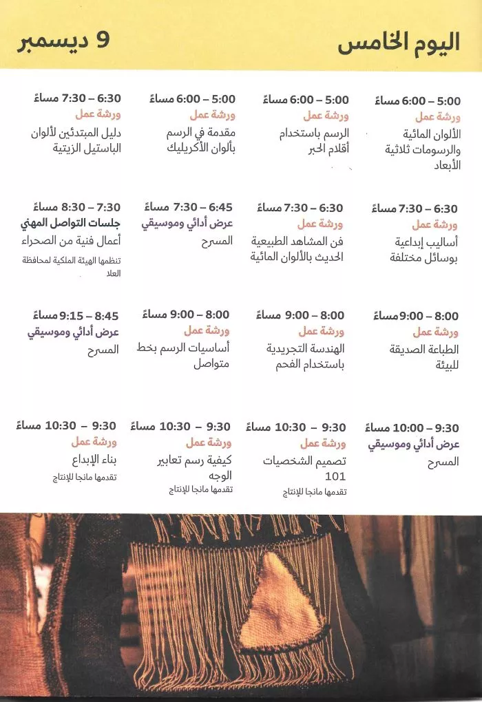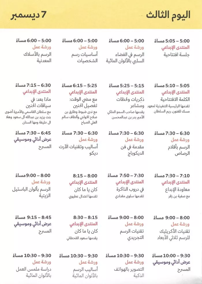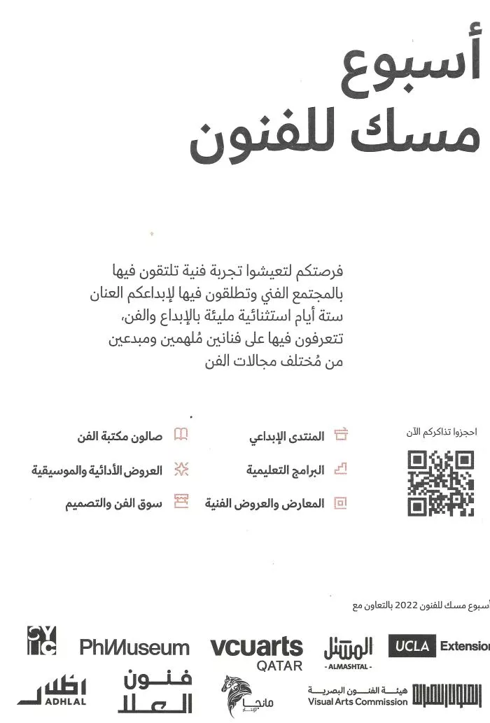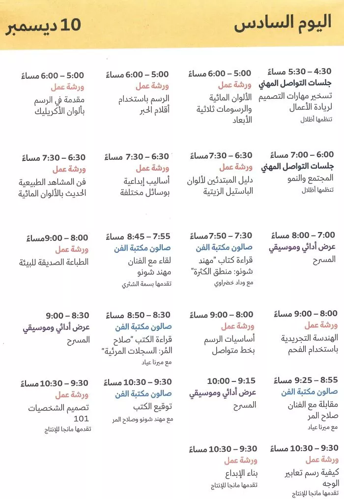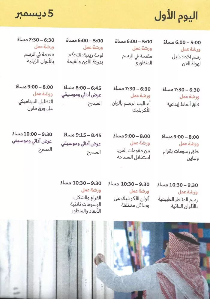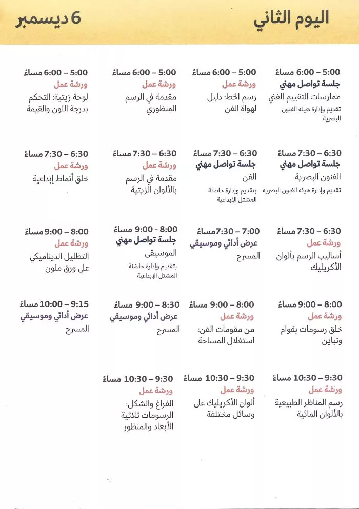 فرصتكم لتعيشوا تجربة فنية تلتقون فيها بالمجتمع الفني وتطلقون فيها لإبداعكم العنان ستة أيام استثنائية مليئة بالإبداع والفن تتعرفون فيها على فنانين مُلهمين ومبدعين مختلف مجالات الفن من