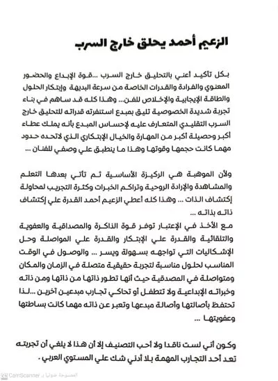 ولأن الموهبة هي الركيزة الأساسية ثم تأتي بعدها التعلم والمشاهدة والإرادة الروحية وتراكم الخبرات وكثرة التجريب لمحاولة إكتشاف الذات ... وهذا كله أعطي الزعيم أحمد القدرة علي إكتشاف ذاته بذاته . ... مع الأخذ في الإعتبار توفر قوة الذاكرة والمصداقية والعفوية والتلقائية والقدرة علي الإبتكار والقدرة علي المواصلة وحل الإشكاليات التي تواجهه بسهولة ويسر ... والوصول في الوقت المناسب لحلول مناسبة لتجربة حقيقية متصلة في الزمان والمكان ومتواصلة في المصدقية حيث أنها تطور ذاتها من ذاتها ومن ذاته وخبراته الإبداعية ولا تتطفل أو تحاكي تجارب مبدعين آخرين ...لذا تحتفظ بأصالتها وأصالة مبدعها وتعبر عن ذاته مهما كانت بساطتها وعفويتها