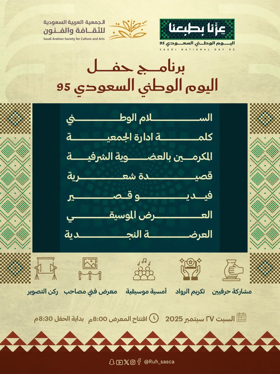 عزنا بطبعنا اليوم الوطني السعودي 95 SAUDI NATIONAL DAY 95 الجمعية العربية السعودية للثقافة والفنون Saudi Arabian Society for Culture and Arts دعوة عامة . الجمعية العربية السعودية للثقافة والفنون بالرياض تدعوكم لحضور احتفالية اليوم الوطني السعودي 95 السبت ٢٧ سبتمبر 2025 الحضور 8:00 م بداية الحفل 9:00 م