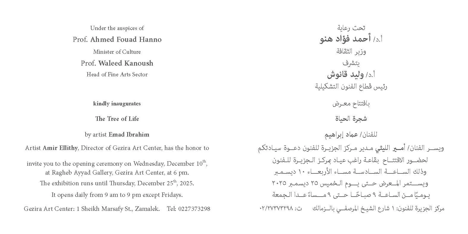 استعدوا لتجربة فنية ملهمة "شجرة الحياة" بمركز الجزيرة للفنون برعاية أ.د/ أحمد فؤاد هنو وزير الثقافة يتشرف أ.د/ وليد قانوش رئيس قطاع الفنون التشكيلية بدعوتكم لحضور افتتاح معرض الفنان عماد إبراهيم، تحت عنوان " شجرة الحياة". وذلك يوم الأربعاء الموافق 10 ديسمبر 2025 الساعة 6 مساءً بقاعة راغب عياد بمركز الجزيرة للفنون Gezira.art.center . يستمر المعرض حتي يوم الخميس 25 ديسمبر 2025. الدخول مجاناً دايماً سعداء بوجودكم المواعيد: يومياً من الساعة 9 صباحاً : الساعة 9 مساءً عدا يوم الجمعة. العنوان: 1 ش الشيخ المرصفي بالزمالك بجوار فندق ماريوت القاهرة. ت: 0227373298 #قطاع_الفنون_التشكيلية