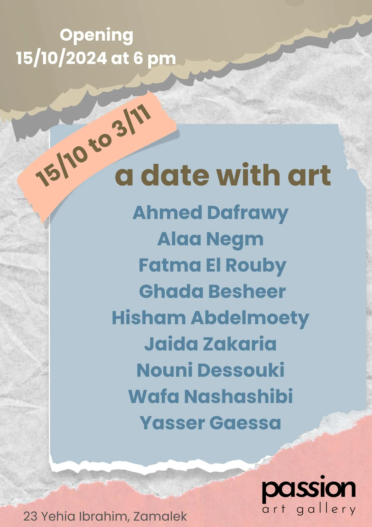 "موعد مع الفن"من 15/10 إلى 11/3يوميا من 12 إلى 8 مساءا ما عدا الجمعة23 شارع يحيى إبراهيم، الزمالكجاليري باشن للفنون