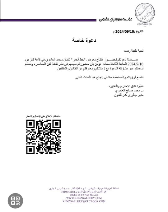 Tuesday 10 September 2024 07:30 PM RED LINE EXHIBITION MOHALA MERI We are honored to invite you to attend the Red Line Exhibition Riyadh Al-Mousa Complex Tower 1 Floor 1 Kanz Gallery Hall