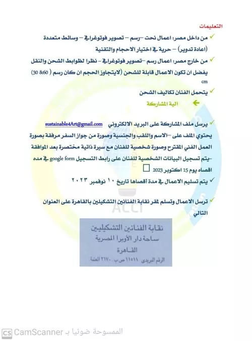 The works will be delivered no later than November 10, 2023. The works will be sent and delivered to the headquarters of the Fine Artists Syndicate in Cairo at the address: