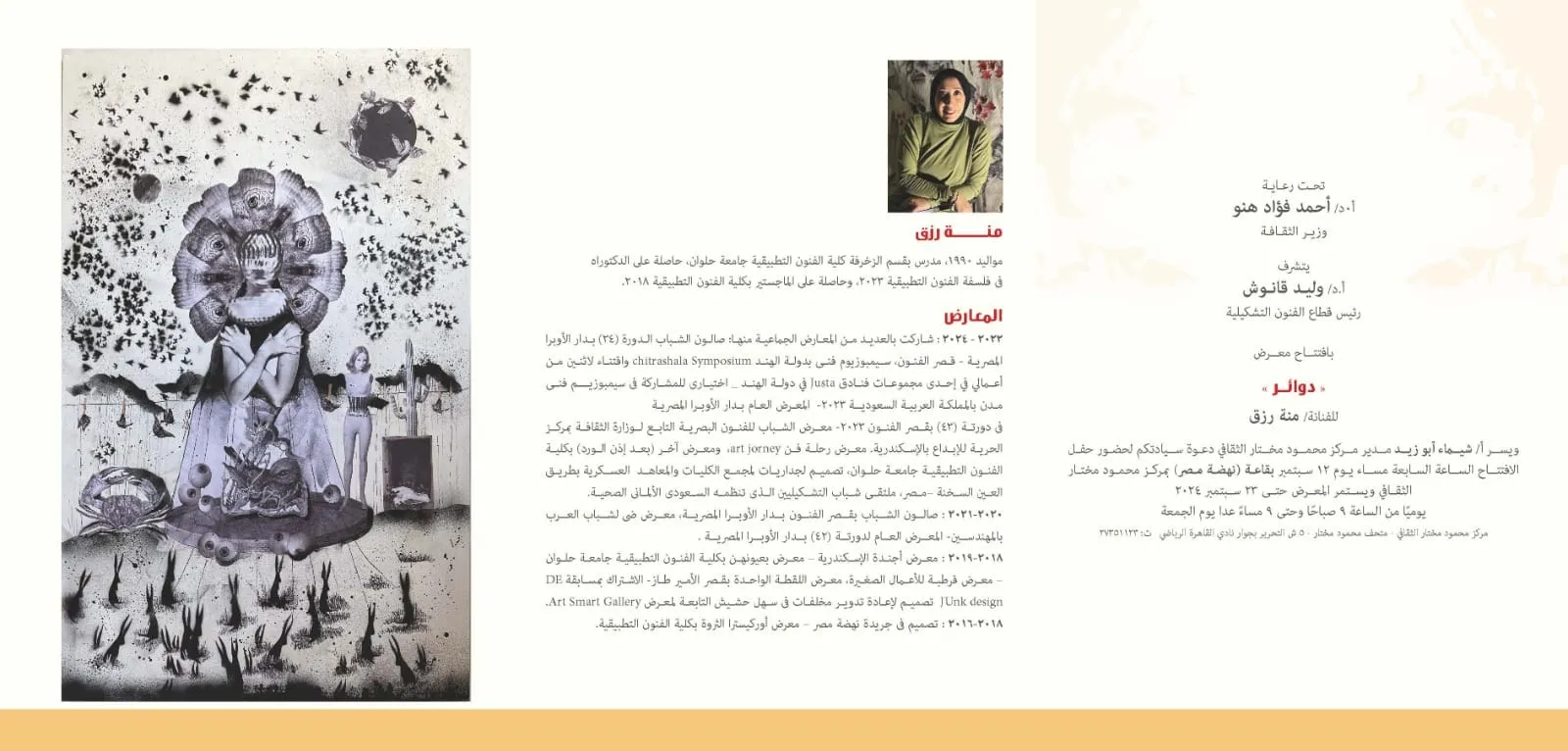 "Circles" At Mahmoud Mokhtar Cultural Center Under the patronage of Prof. Dr. Ahmed Fouad Hano, Minister of Culture, Prof. Dr. Walid Qanoush, Head of the Fine Arts Sector, will open the exhibition of artist/ Mona Rizk entitled "Circles" at 7 pm on Thursday, September 12, 2024, in the (Nahdet Misr) Hall at Mahmoud Mokhtar Cultural Center. The exhibition will continue until September 23, 2024. Appointments: Daily from 9 am to 9 pm, except Friday. Address: 5 Tahrir Street, next to Cairo Sports Club. T: 0227351123 #Fine_Arts_Sector Mahmoud Mokhtar Cultural Center
