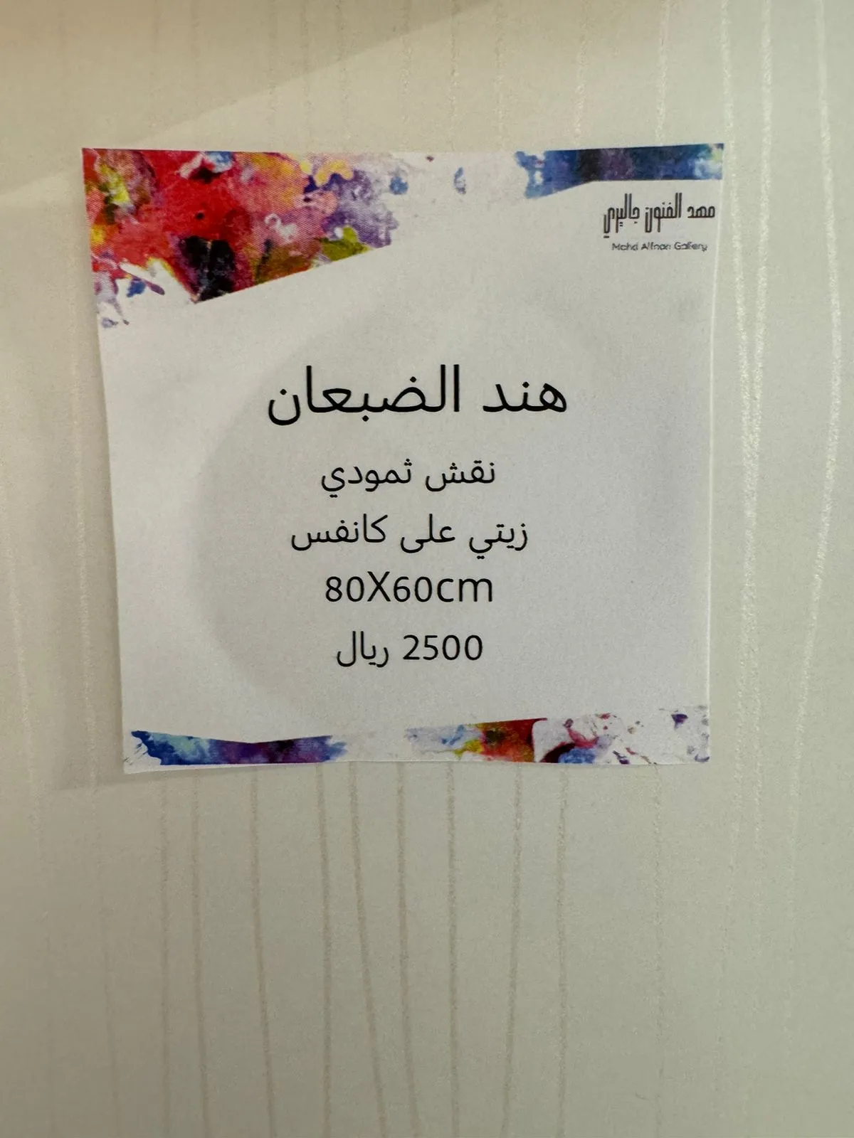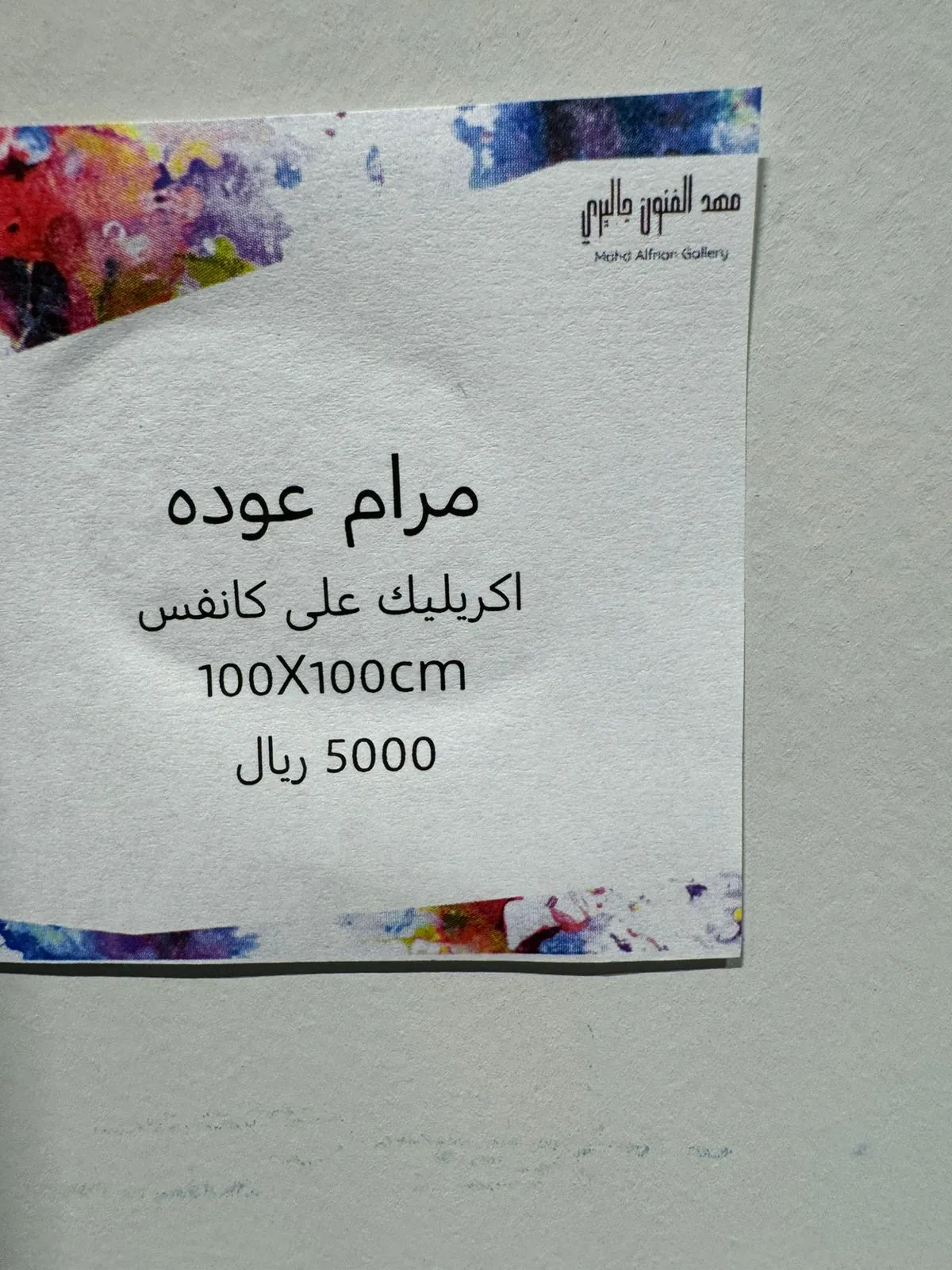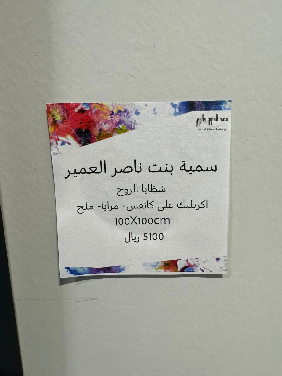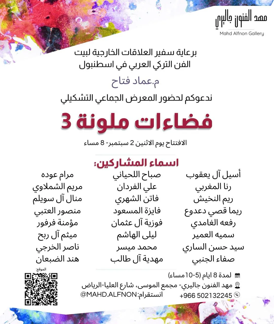 We are honored and pleased to have you attend the opening of the group exhibition (Colorful Spaces 3) Mahd Alfnon Gallery - Riyadh https://maps.app.goo.gl/VnkjwPft5x2ywfsr7?g_st=ic -