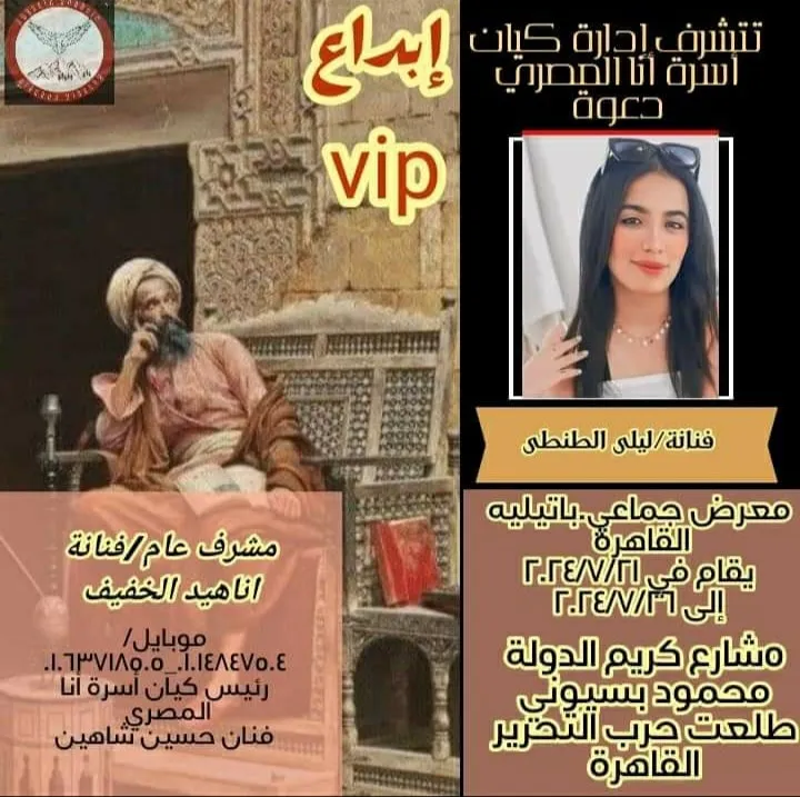 Ana Al-Masry family entity. Creativity exhibition. A group exhibition for all male and female artists. Everyone expresses and creates what he likes Head of the Ana Al-Masry family entity, artist Hussein Shaheen. From July 21, 7 pm until July 26, 9 pm