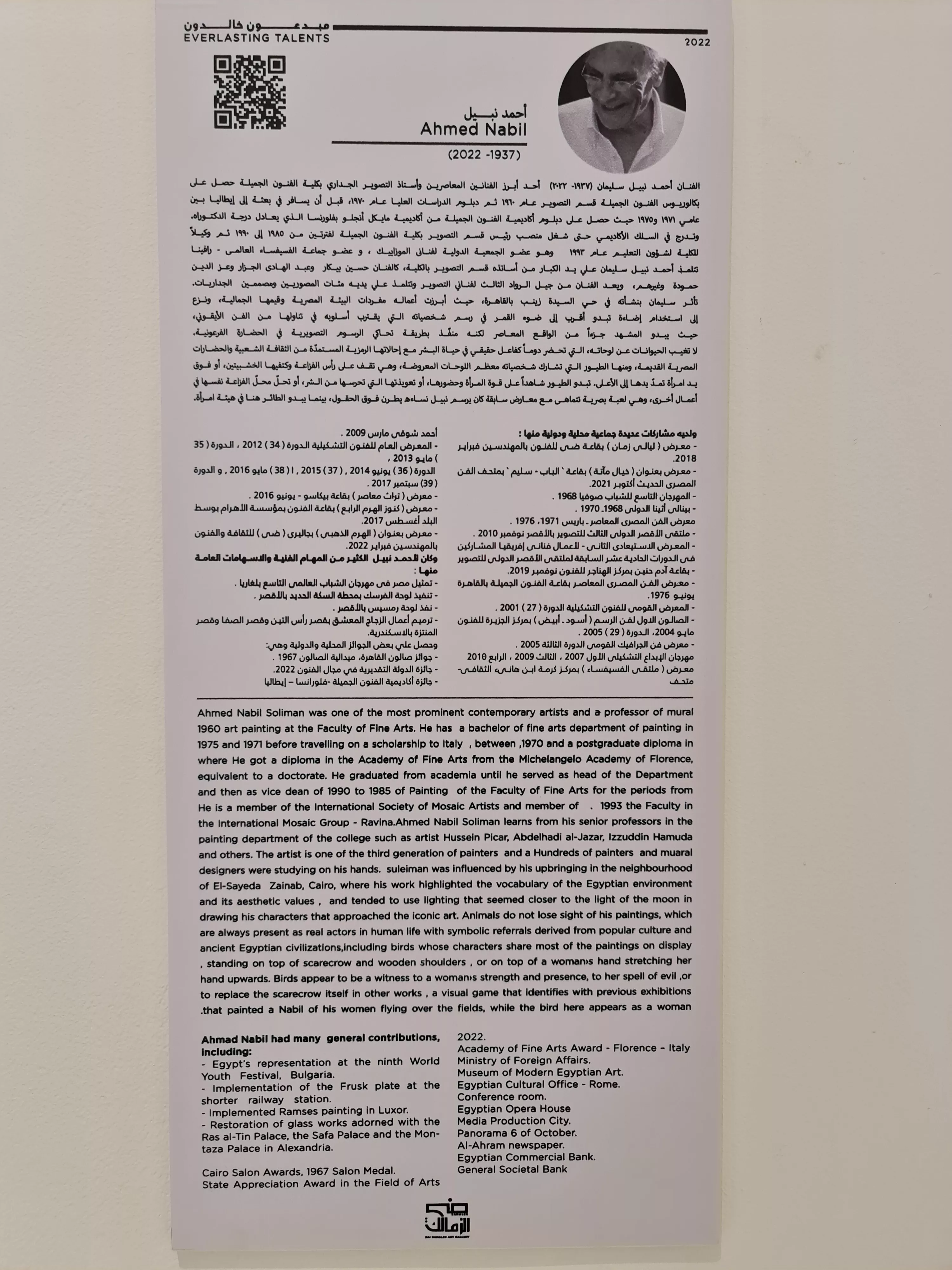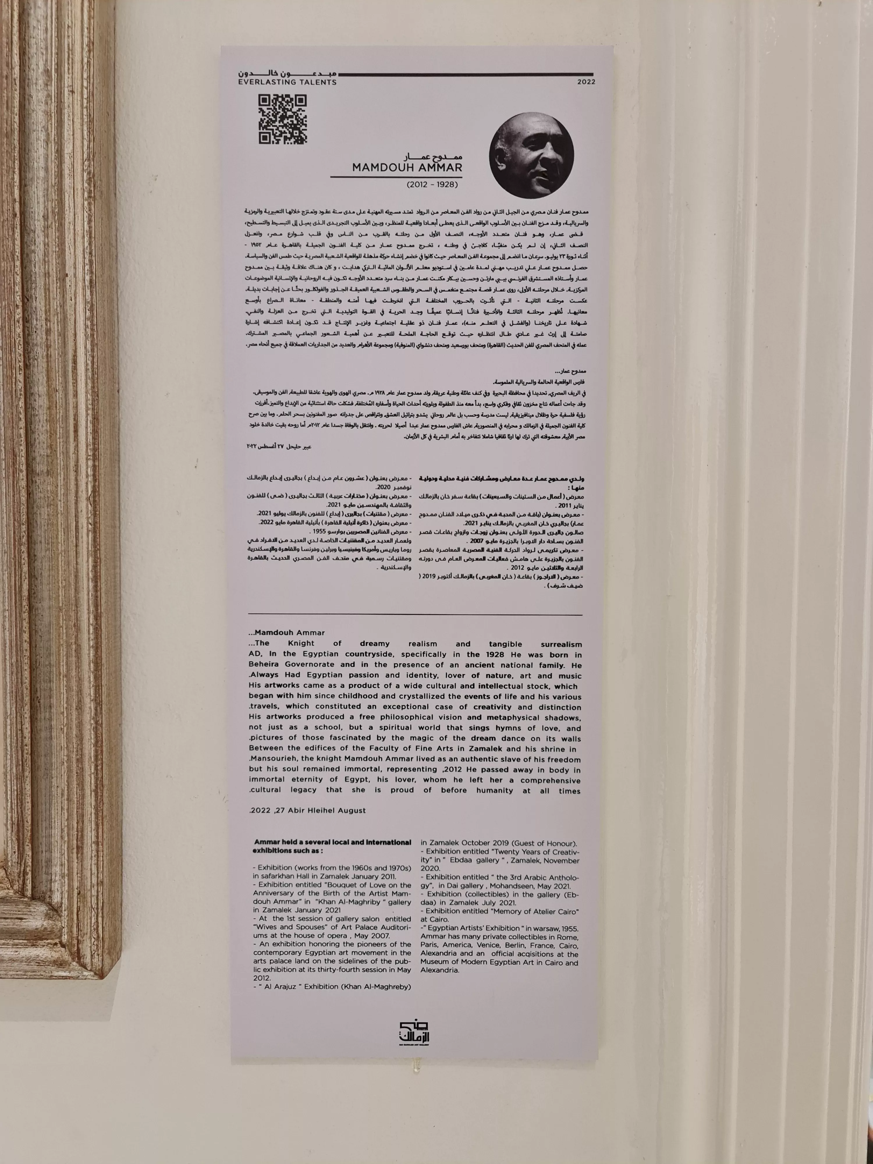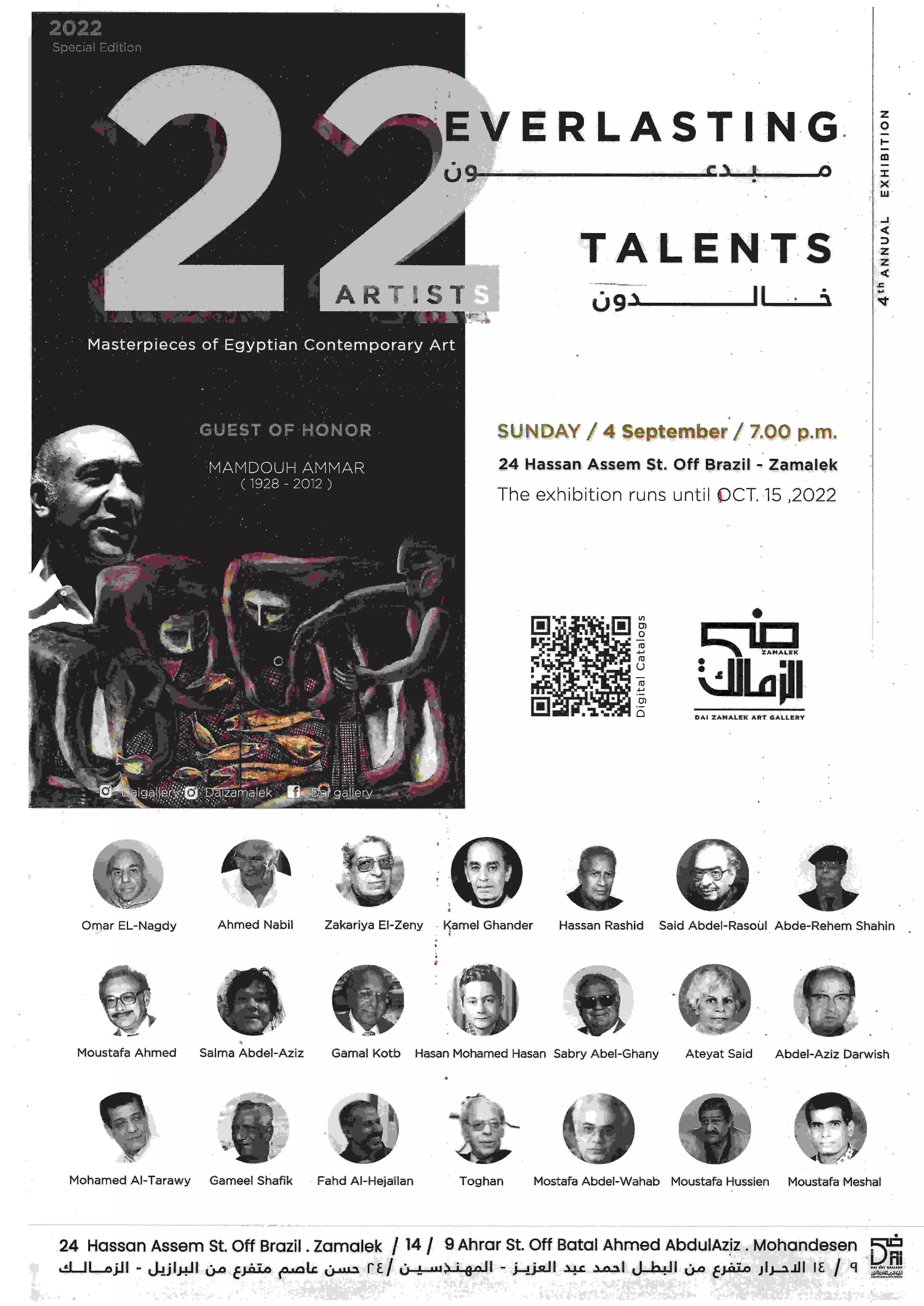 The 4th annual art exhibition Everlasting Talents will be held at Dai Art Gallery in Zamalek and Mohandessin from September 4th to mid-October 2022. The exhibition will feature artworks by 22 artists from the pioneers of the Egyptian Contemporary art movement, Guest of Honor Mamdouh Ammar.