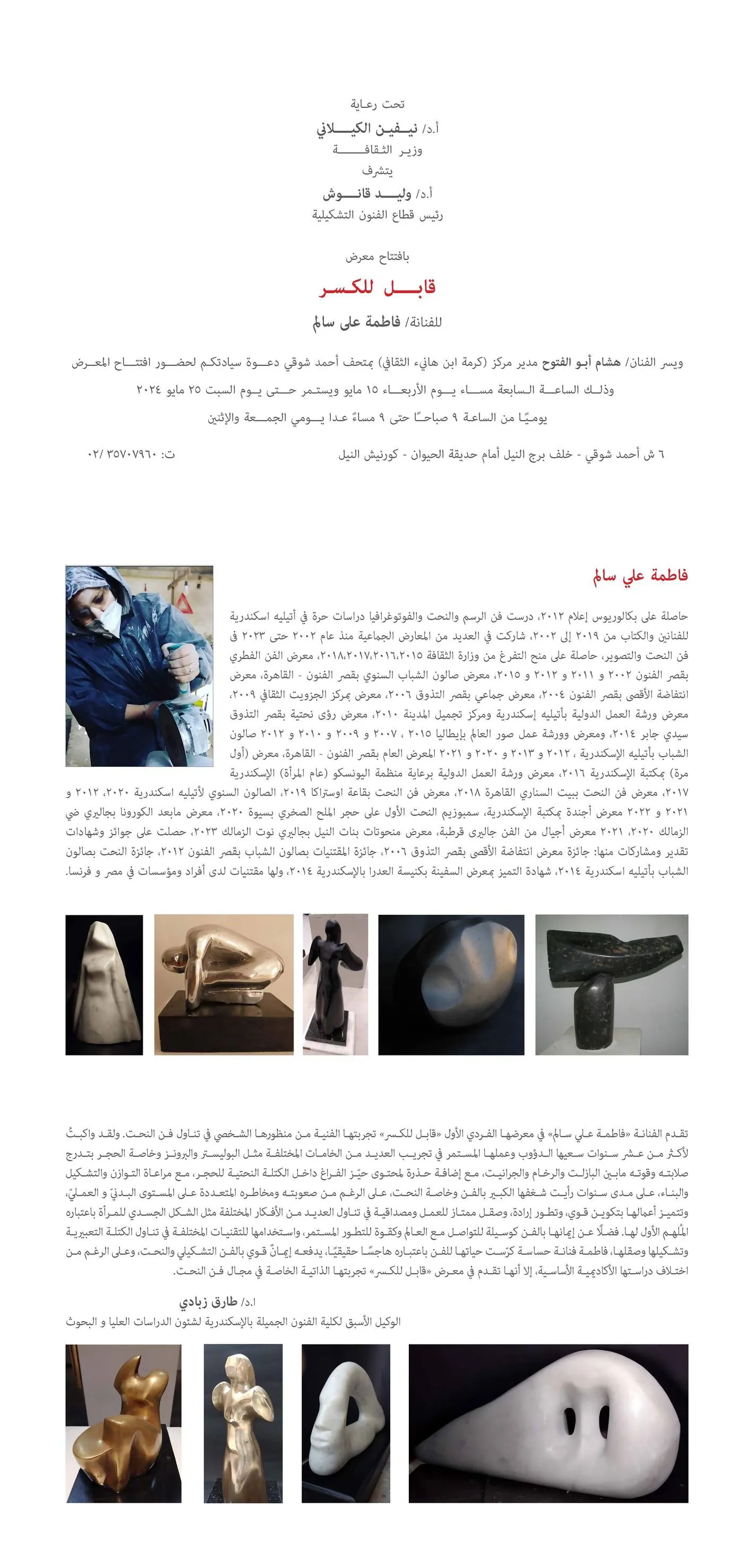 breakable At the Karma Bin Hani Cultural Center Under the patronage of Prof. Dr. Nevin Al-Kilani, Minister of Culture, Prof. Dr. Walid Qanoush, Head of the Fine Arts Sector, kindly opened the artist Fatima Ali Salem’s exhibition under the title (Freakable), at exactly 7 pm on Wednesday, May 15, 2024, at the Karma Bin Center. Hani Cultural Museum, Ahmed Shawqi. The exhibition runs until May 25, 2024. Timings: Daily from 9 am to 9 pm, except for Friday and Monday. Address: 6 Ahmed Shawky Street - behind the Nile Tower in front of the Zoo - Nile Corniche in Giza. Tel: 0235707960 Waiting to honor you #Fine_Arts_Sector