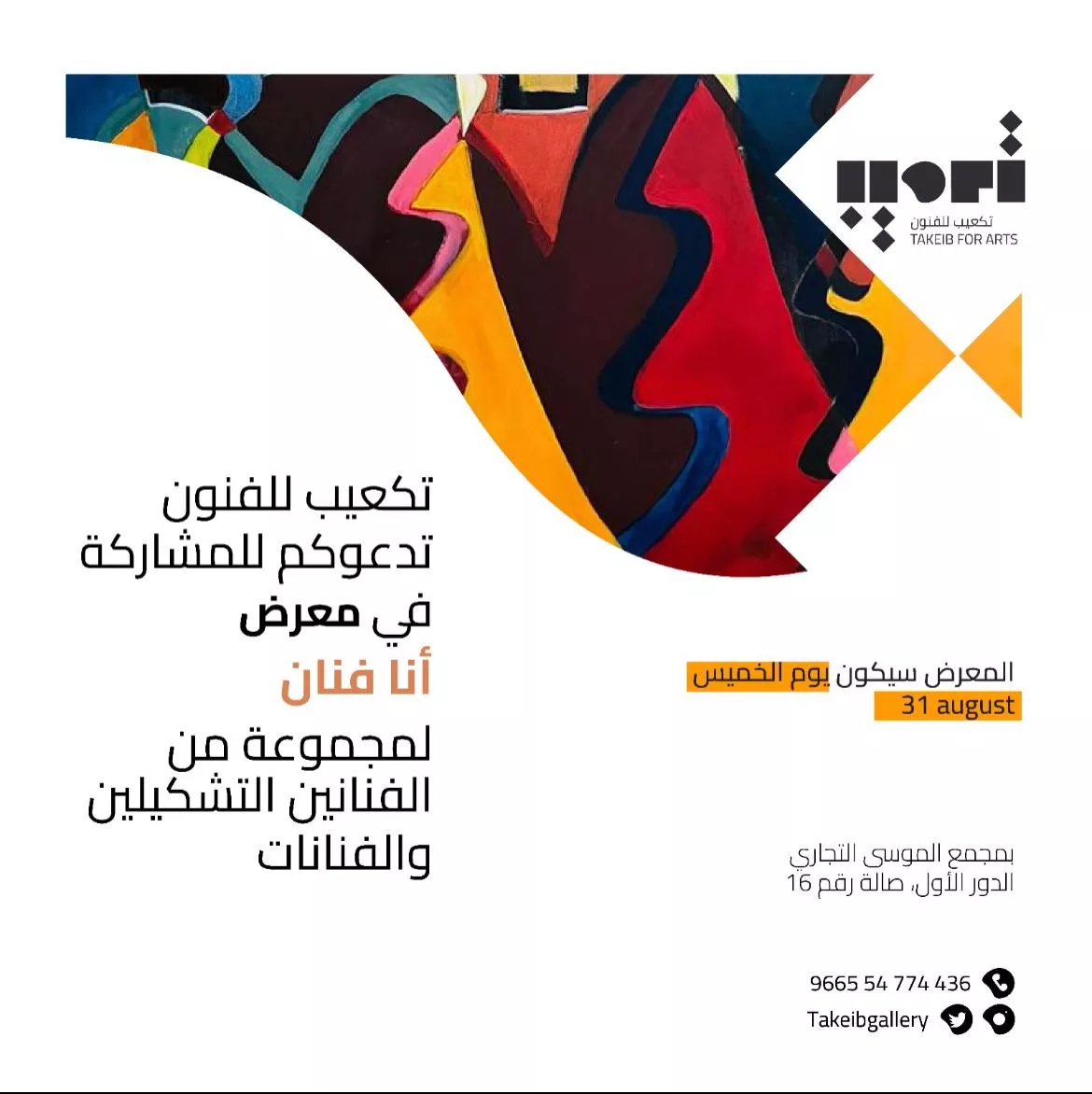 Names of the participants in the “I Am an Artist” exhibition, Director of the Gallery, Mr. Abdullah Al-Tamami 1 - Laila Johar 2- Fahd bin Nasser Al-Rubaiq 3- Munirah Al-Saleem 4- Muhammad Benten 5- Amal Saleh Al-Barout 6- Rehab Aburas 7- Bushra Al-Dajani 8 - Hussein Ali Al-Tamar 9 - Al-Anoud Al-Zariq 10 - Zakia Al-Saqabi 11 - Hashem Al-Jamaan 12 - Nawal Hussein (Kuwait) 13 - Omar Al-Rashed 14 - Amal Al-Baz 15- Narah Saad 16 - Rawan Al-Maliki 17 - Noura bint Abdul Rahman 18 - Modi Abdel Aziz 19 - Ghadeer Al-Otaibi 20 - Fatima Ahmed 21 - Nouf Al-Zaid 22 - Wafa Abdel Aziz 23- Nujoud Abdullah 24 - Aisha Asiri