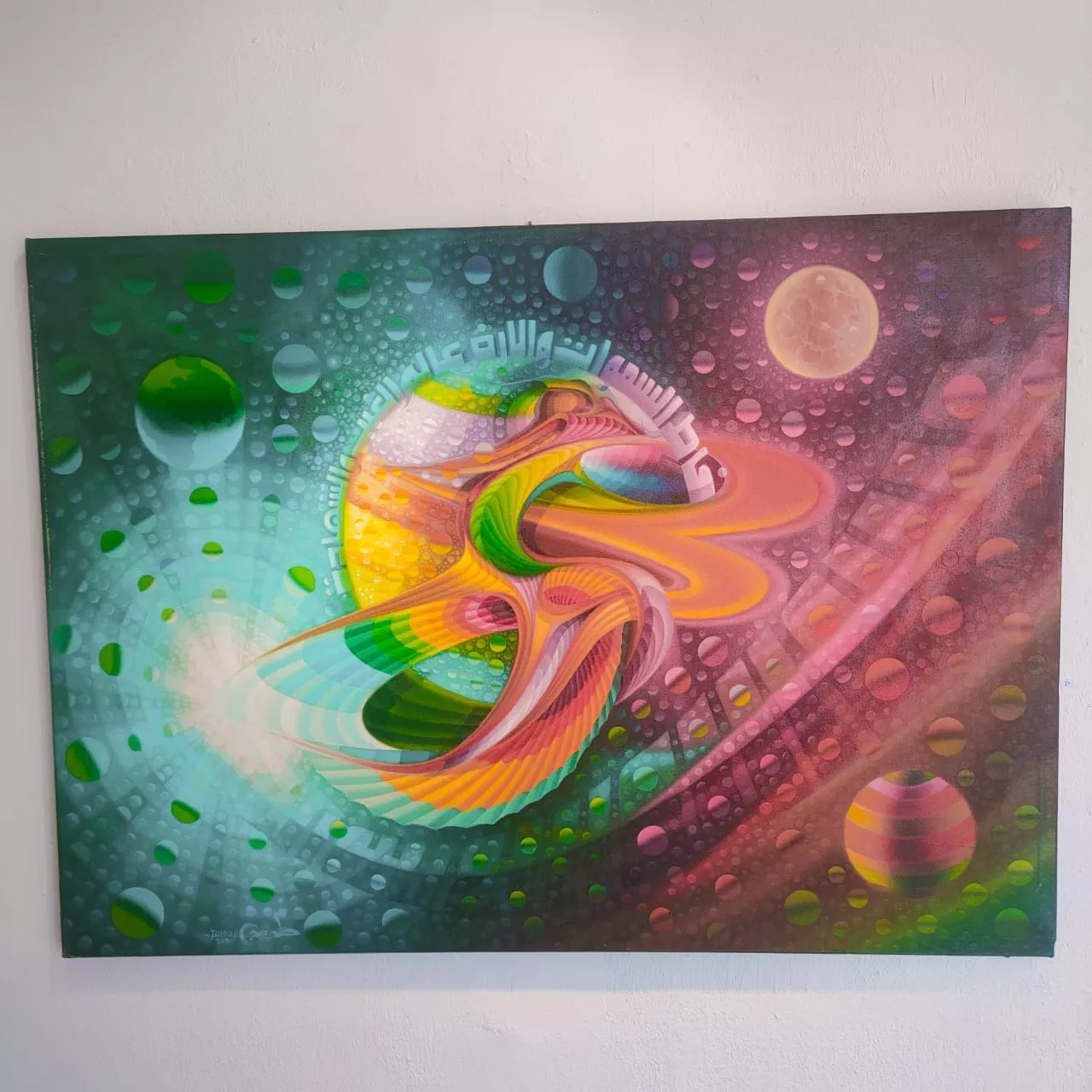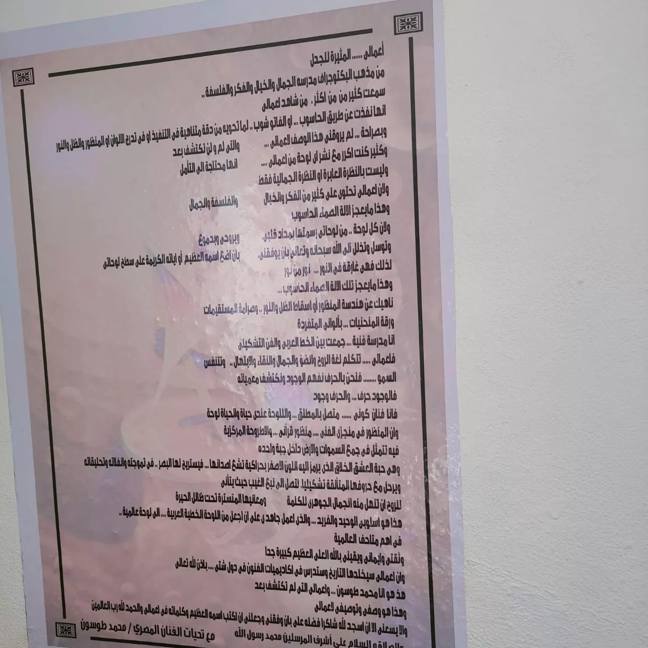 The artist, Mohamed Toson, says, “My works belong to the pictograph doctrine and depend on extreme accuracy in execution, or in the gradation of colors, or perspective, shadow, and light. In my style, I combine Arabic calligraphy and fine art, and all my works are from a Qur’anic perspective. They also require contemplation to understand the meaning and its geometric composition in addition to the perspective.” Aesthetic. The exhibition is scheduled to continue until March 9, 2024.