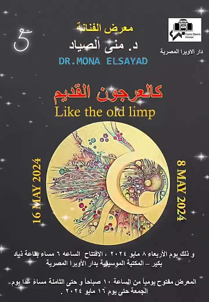 The Ziad Bakir Hall at the Cairo Opera House is hosting an exhibition entitled “Like an Old Argoun” by artist Dr. Mona Al-Sayyad. It opens at six in the evening on Wednesday, May 8, and continues until Thursday, May 16. The exhibition includes 40 paintings executed with a variety of materials, including oil colors on canvas, gold leaf, and colored pencils, inspired by the sciences of astronomy, planets, the sun, and the moon. It deals with the stages of the moon’s development through curvy, circular, and curved lines that suggest movement, permanence, and continuity. It is noteworthy that the artist Mona Al-Sayyad holds a Bachelor’s degree in Art Education from Helwan University, a Doctorate in Design Philosophy, and a member of the Fine Artists Syndicate. She participated in many group art exhibitions inside and outside Egypt, including the Sharm El-Sheikh International Biennale, and this is her fifth exhibition during the current year.