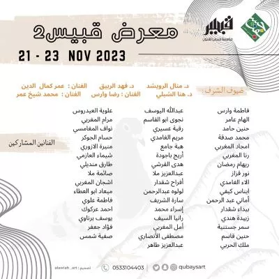 Fier Qubais Exhibition 2 21-23 NOV 2023 In honor of Counselor Fahd Al-Rubaiq The Qubais Foundation invites you to attend Qubais Second Exhibition In Riyadh the date 7 to 9 Jumada al-Awwal Tuesday to Thursday Riyadh Saudi Society of Fine Arts Hall (GSFT) Opening 8-10 pm