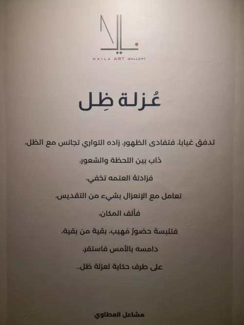 NAILA ART GALLERYShadow isolationMashael Al-Atawi2023 November 27-30Nayla Gallery, Al-Takhasosi Street, Riyadhwww.gallerynaila.com
