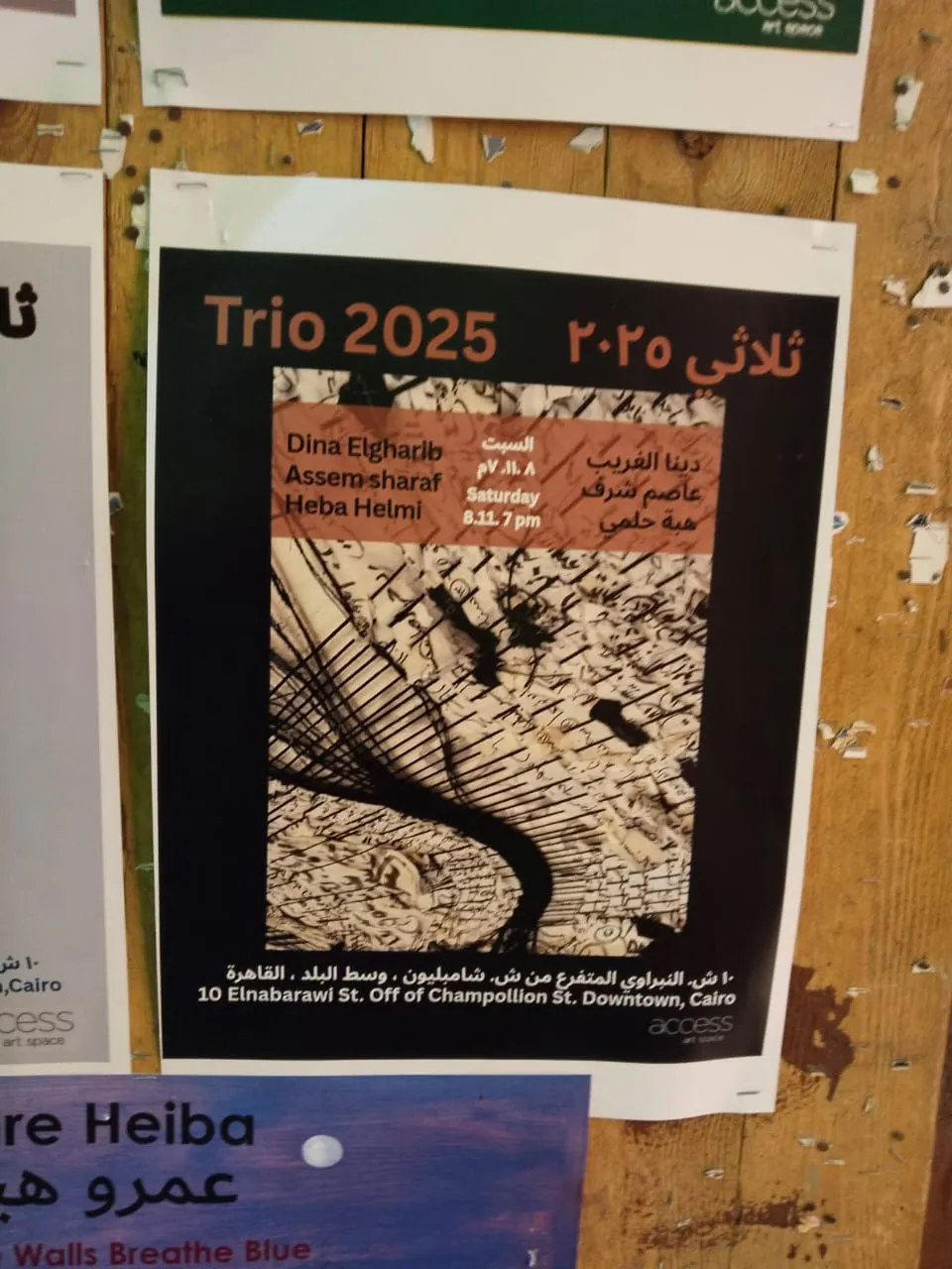 Access Artspace invites you to the opening of " TRIO 2025 " Dina El Gharib - Assem Sharaf - Heba Helmi Three distinguished Egyptian artists whose creative journeys span painting , calligraphy, and mixed media reunite for their second trio exhibition of 2025. The exhibition is dedicated to Gaza , reflecting the artists' shared emotional and human response to its ongoing struggle . Through Helmi's expressive calligraphic works , El Gharib's evocative collages , and Sharaf's powerful figurative paintings , the show creates a visual dialogue of resilience, loss and hope An art event that carries a message from the heart of humanity . Date : Saturday , November 8th, 2025 time : 7:00 PM location : 10 Elnabarawi St. Off of Champollion St. downtown,cairo