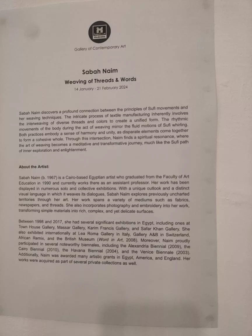 Sabah NaimWeavings of Threads & Words14/1-21/2/2024HGallery of Contemporary ArtMorning bliss, textiles made of threads and words