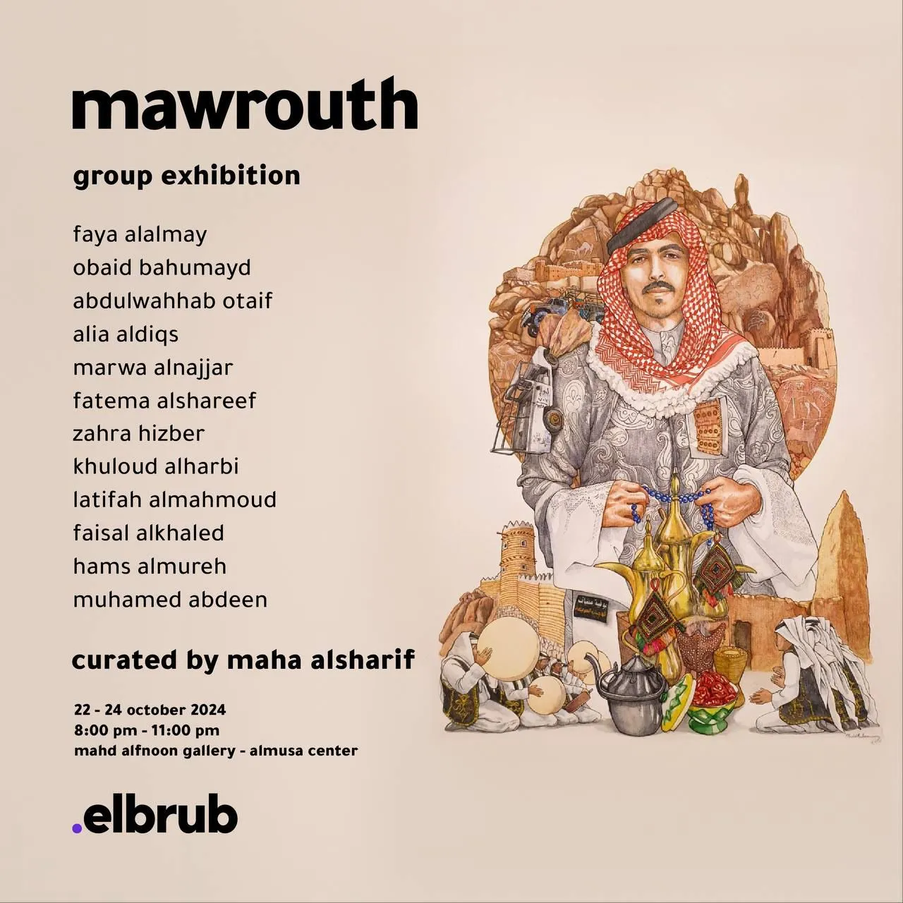 Welcome to the group exhibition (mawrouth) Which reflects all the heritage of our history, customs and culture Artistic curators: Maha Al-Sharif Fayeh Al-Almai Obaid Bahumid Abdul Wahab Atif Alia Al-Daqs Marwa Al-Najjar Fatima Al-Sharif Zahra Hazbar Kholoud Al-Harbi Latifa Al-Mahmoud Faisal Al-Khaled Hams Mihrih Mohammed Abdeen Starts from Tuesday, October 22 to October 24 From 8 to 11 pm At Mahd Al-Funun Gallery - Al-Mousa Complex