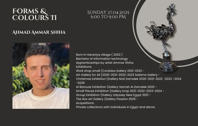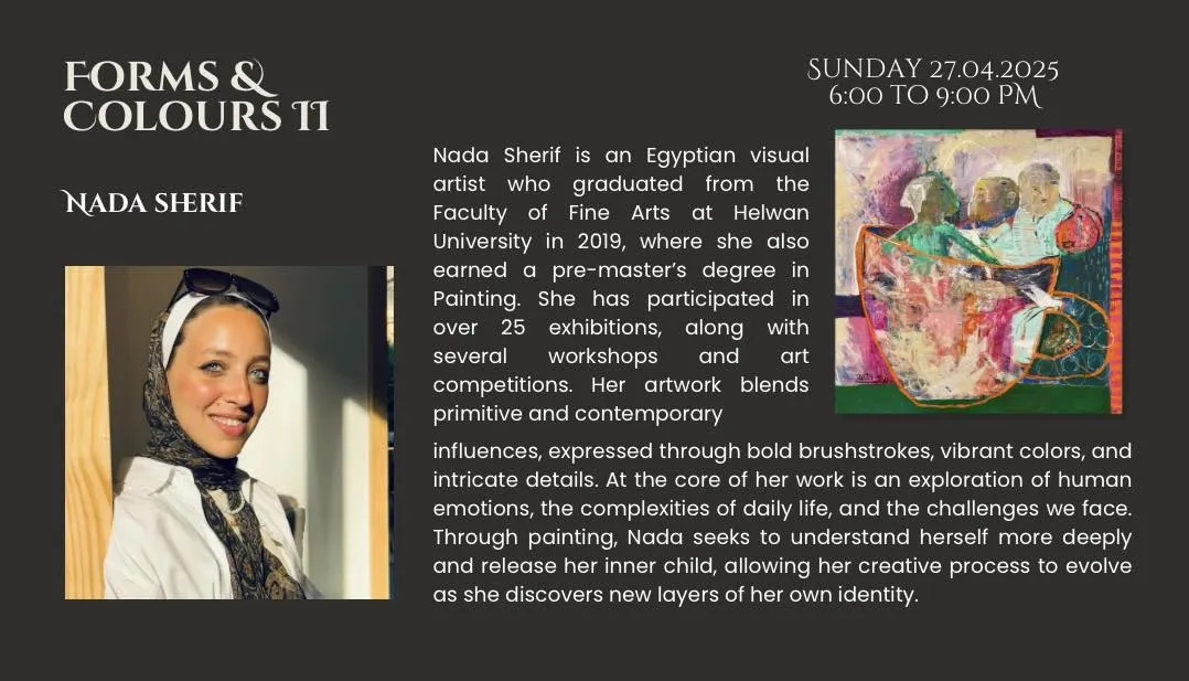 · معرض "أشكال وألوان" هو سلسلة معارض، حيث تلتقي أنواع مختلفة من الفن لتروي قصصًا مميزة. في هذا المعرض الافتتاحي، يعرض لوحات فنية وأعمال نحتية لثلاث فنانين أساسيين وفنان او فنانه تم اختيارهام من معرض صالون الشباب. يقدم كل فنان وجهة نظره الخاصة، باستخدام أشكال وألوان ومواضيع وتقنية مختلفة لتأكيد العلاقة بين التقنية الفنية والمشاعر الخاصة بكل فنان. “Forms & Colours - II” Sunday, April 27th Passion Art Gallery 6 pm