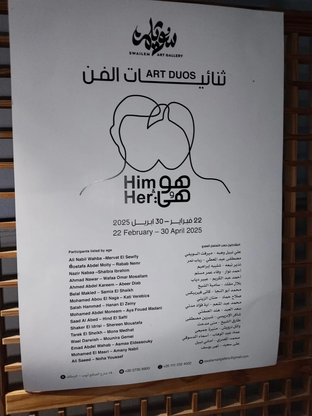 المشاركون حسب التسلسل المصري علي نبيل وهبه - ميرفت السويفي مصطفى عبد المعطي - رباب نمر نذير نبعه - شلبيه إبراهيم أحمد نوار - وفاء عمر مسلم أحمد عبد الكريم - عبير دياب بلال مقلد - سامية الشيخ محمد أبو النجا - كاتى فيربيكس صلاح حماد - حنان الزيني محمد عبد المنعم - آية فؤاد مدني سعد العبد - هند الصفتي شاكر الإدريسي - شيرين مصطفى طارق الشيخ - منى مدحت وائل درويش - منيرة جميعي عماد عبد الوهاب - أسماء الدسوقي محمد المصري - أماني نبيل على سعيد - نهي يوسف 8900 202735 14 شارع الصالح أيوب - الزمالك . +201112324002 swailemartgallery@gmail.com