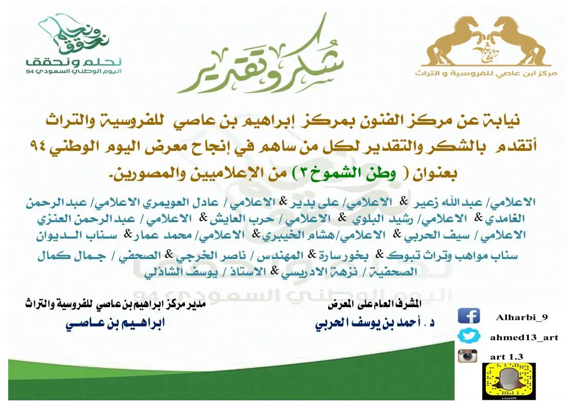مركز ابن عاصي للفروسية والتراث نحلم ونحقق اليوم الوطني السعودي 94 مركز بن عاصي للفروسية والتراث بتبوك معرض ( وطن الشموخ 3 ) الذي سيقام بمركز بن عاصي خلال الفترة الخميس ٢٠٢٤/٩/١٩ الموافق ١٦ / ٣ / ١٤٤٦هـ ولمدة 5 أيام