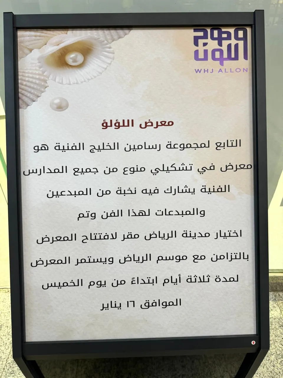 رسامين الخليج GULF PAINTERS WHJ ALLON دعوة خاصة يسر وهج اللون جاليري بالتعاون مع مجموعة رسامين الخليج أن يدعوكم على شرف رئيس مجلس ادارة الجمعية السعودية للفنون التشكيلية د . هناء الشبلي لحضور معرض اللؤلؤ بتاريخ 2025/1/18-16 لمدة ثلاث ايام من الساعة 10-4 وقت الأفتتاح الساعة ٨:٠٠ مساءً الرياض مجمع الموسى التجاري بالعليا الدور الأول