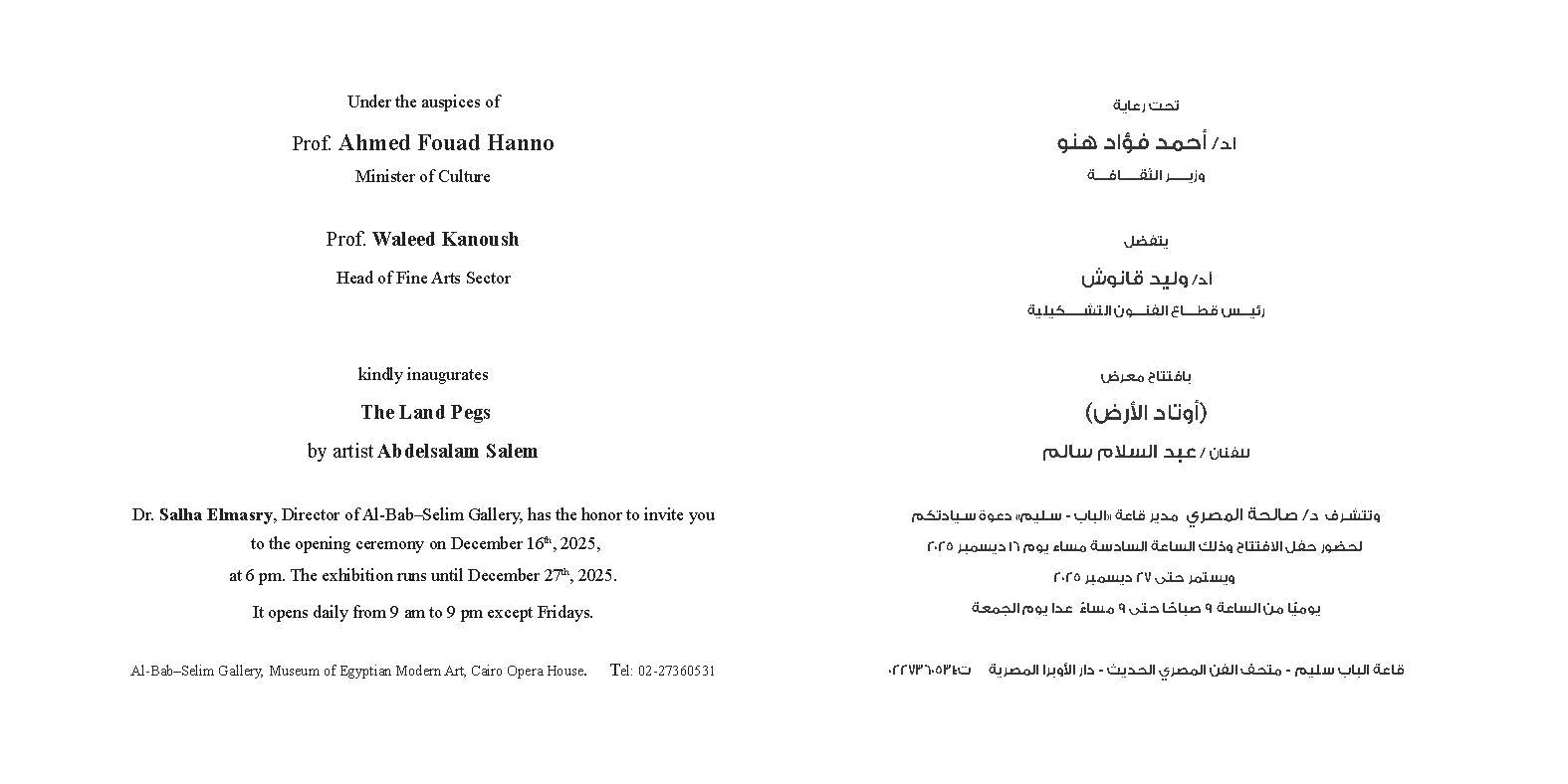 "أوتاد الأرض" بقاعة الباب - سليم برعاية أ.د/ أحمد فؤاد هنو وزير الثقافة يتشرف أ.د/ وليد قانوش رئيس قطاع الفنون التشكيلية بافتتاح معرض الفنان/ عبد السلام سالم بعنوان "أوتاد الأرض" في انتظاركم الساعة الـ 6 مساء يوم الثلاثاء 16 ديسمبر 2025 بقاعة الباب - سليم El Bab Gallery دار الأوبرا المصرية. يستمر المعرض حتى 27 ديسمبر 2025. في انتظار تشريفكم. المواعيد: يومياً من الساعة 9 صباحاً : الساعة 9 مساءً عدا يوم الجمعة. العنوان: قاعة الباب – متحف الفن المصري الحديث دار الأوبرا المصرية. ت: 0227360531 #قطاع_الفنون_التشكيلية