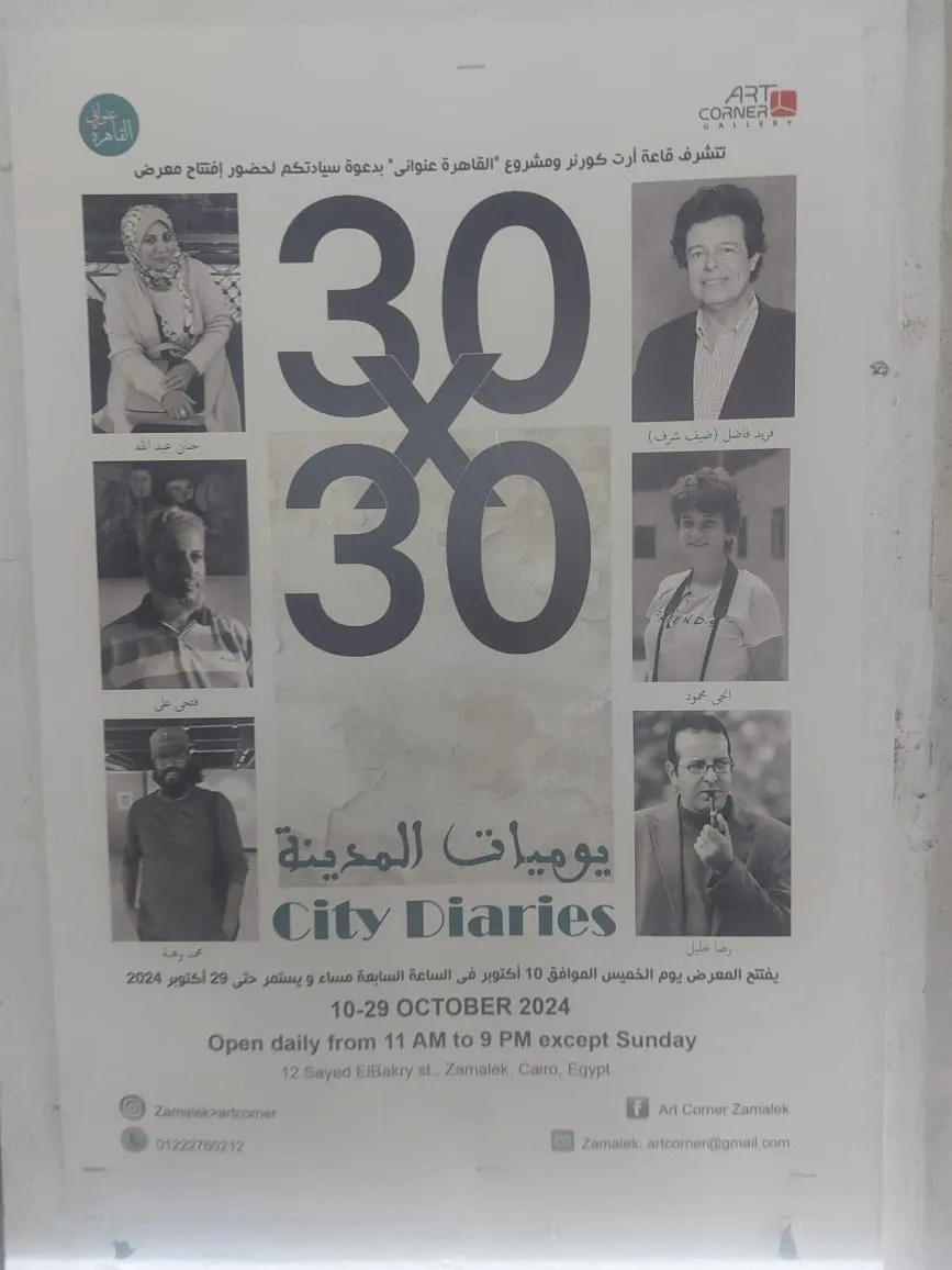 تتشرف قاعة أرت كورنر ومشروع القاهرة عنواني" بدعوة سيادتكم لحضور إفتتاح معرض 30x 30 يوميات المدينة حنان عبد الله فريد فاضل ( ضيف شرف) انجي محمود فتحى على رضا خليل محمد وهبة