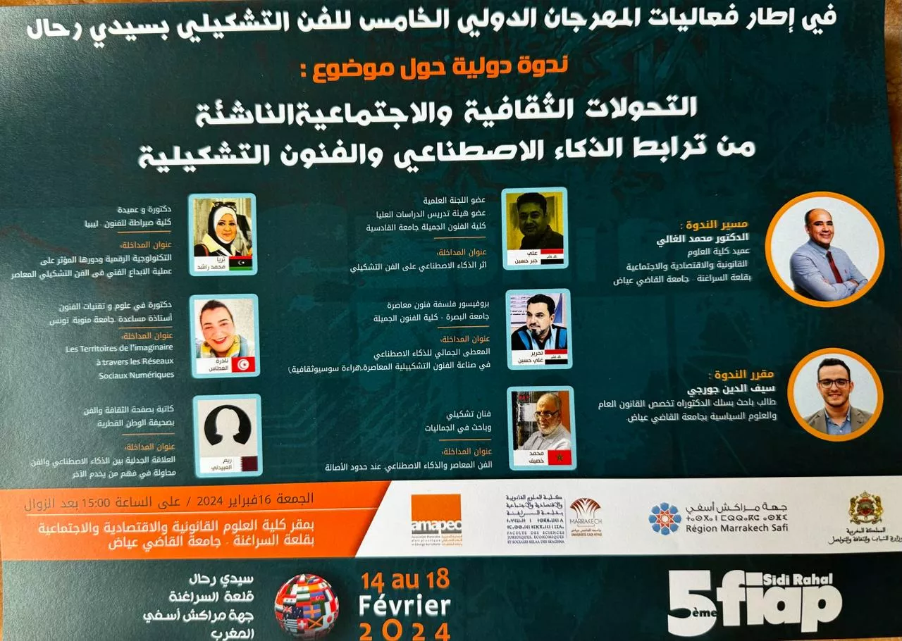 البرنامج الأربعاء 14 فبراير PROGRAMME 10:00 استقبال المشاركين بالفندق.. (مراكش ) 18:00 ندوة صحفية وافتتاح فعاليات المهرجان مع إعطاء انطلاقة تصوير فلم وتائقي عن مدينة سيدي رحال وتاريخها العمراني 20:00 مأدبة عشاء على شرق الفنانين المشاركين الخميس 15 فبراير 07:00 وجبة الإفطار 11:00 زيارة المعرض الصور الفوتوغرافية تحت عنوان : إبداع الذكاء الاصطناعي بساحة الحديقة سيدي رحال 12:00 الشروع في ورشة الجداريات الشروع في ورشات الرسم للفنانين المشاركين بدار الطالب والطالبة سيدي رحال 14:00 وجبة الغداء النزلاء دار الطالب والطالبة على شرف الفنانين المشاركين 15:30 إتمام ورشات الرسم والجداريات 20:00 عرض فلم سينمائي الأطفال المدينة بساحة الحديقة سيدي رحال 21:00 وجبة العشاء الجمعة 16 فبراير 07:00 وجبة الإفطار 09:00 زيارة حد الق ماجوريل مراكش 13:00 وجبة الغداء بقلعة السراغنة 15:00 ندوة دولية حول موضوع : Sidi التحولات الثقافية والاجتماعية الناشئة من ترابط الذكاء الاصطناعي والفنون التشكيلية بحقر جامعة العلوم الاقتصادية والقانونية والاجتماعية بقلعة السراغنة 21:00 وجبة العشاء السبت 17 فبراير 07:00 وجبة الإفطار 14- 18 Février 2024 08:00 رحلة سياحية خاصة بالفنانين المشاركين وتشمل: الموقع الأثري إيوارضن - للنقوش الصخرية لإيزيت تارغيست قصبة بوغال - زيارة متحف الدينصورات بأزيلال - زيارة شلالات أوزود بأزيلال 10:00 مسابقة في الفن التشكيلي لفائدة المواهب في مجال التشكيل التابعين للإقليم بدار الثقافة - سيدي رحال 17:00 تنشيط ورشة فن الشوارع بساعة الحديقة الأحد 18 فبراير 07:00 وجبة الإفطار 11:00 عرض الفلم الوثائقي سيدي رحال التاريخ والحضارة للمخرج الألماني Saffyan Mirza - بدار الثقافة سيدي رحال 12:00 - تسليم شواهد المشاركة - تسليم جوائز الفائزين في مسابقة الفن التشكيلي تكريم فعاليات محلية ووطنية 13:00 حفل غداء على شرف الضيوف والمشاركين بدار الزاوية سيدي رحال 19:00 افتتاح معرض الأعمال الفنية للدورة الخامسة برواق جوهرة الشرق 72 إقامة الفندوري . زنقة يوغور لا فيا - فيليز - مراكش 20:00 - رفع توصيات فنية الجماعة سيدي درحال على شكل وثيقة موقعة من طرف كافة المشاركين توقيع إصدار الدورة الخامسة اختتام فعاليات الدورة الخامسة للمهرجان 21:00 وجبة العشاء