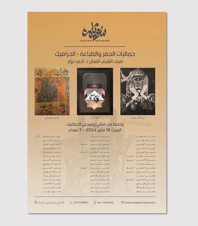 سويلمSWAILEM ART GALLERYجماليات الحفر والطباعة - الجرافيك ضيف الشرف الفنان د. أحمد نوارونخبة من فناني ومبدعي الجرافيك السبت 18 مايو 2024 - 7 مساء