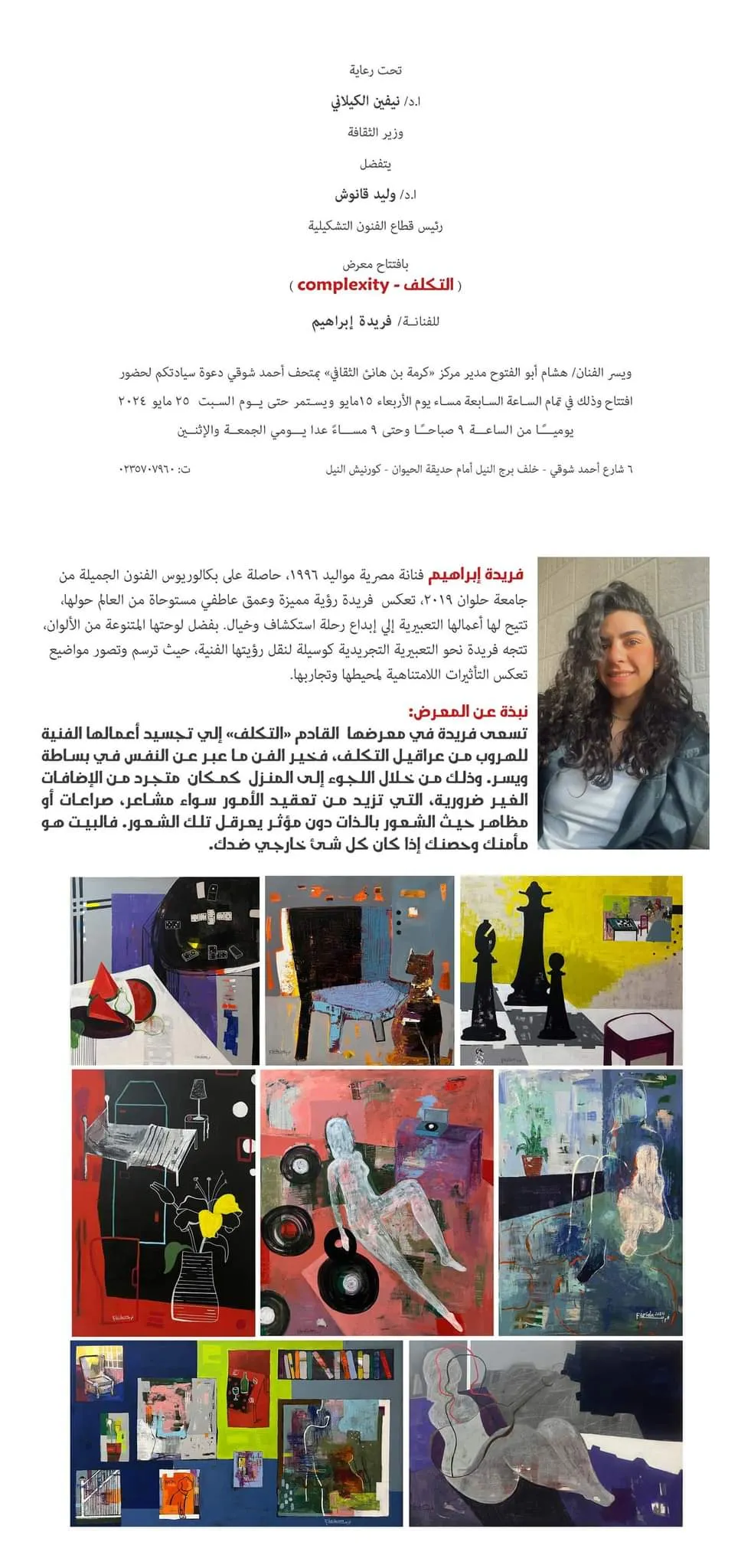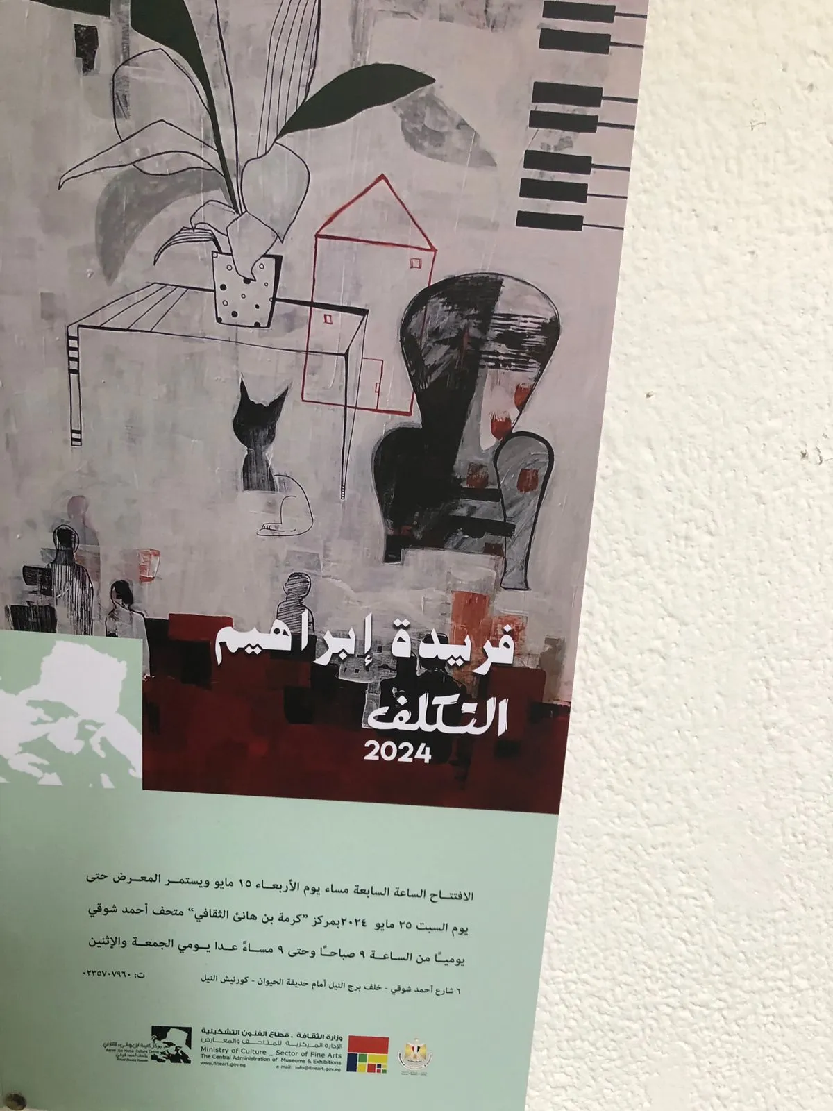 (التكلف) بمركز كرمة بن هانئ الثقافي برعاية أ.د/ نيفين الكيلاني وزيرة الثقافة يتفضل أ.د/ وليد قانوش رئيس قطاع الفنون التشكيلية بافتتاح معرض الفنانة/ فريدة إبراهيم تحت عنوان (التكلف) وذلك في تمام الساعة الـ 7 من مساء يوم الاربعاء الموافق 15 مايو 2024 بمركز كرمة بن هانئ الثقافي بمتحف أحمد شوقي. يستمر المعرض حتى 25 مايو 2024. المواعيد: يومياً من الساعة 9 صباحاً : الساعة 9 مساءً عدا يومي الجمعة والاثنين. العنوان: 6 ش أحمد شوقي – خلف برج النيل أمام حديقة الحيوان – كورنيش النيل بالجيزة. ت: 0235707960 في انتظار تشريفكم #قطاع_الفنون_التشكيلية