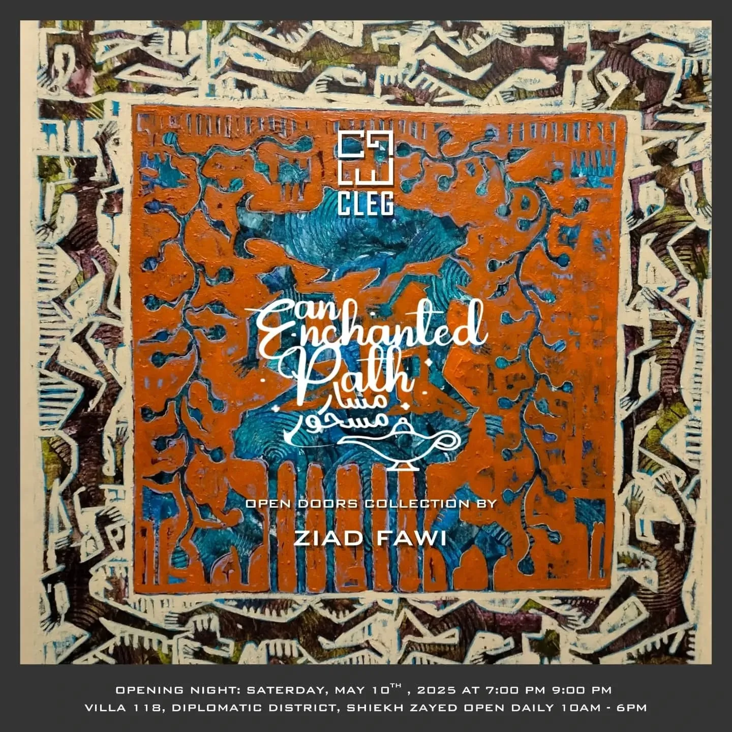 علي مسار مسحور يأخذنا ثلاث فنانون كل منهم جذوره ضاربة في أرض قامت عليها حضارات العالم الي رحلة استثنائية عبر طرقات ملونة برموز و حروف و صور تندمج و تنفصل لتشكل رغبة ملحة لقرائة ما يقرأ و ما لا يقرأ. Saturday, 10th May. 2025 7:00 pm - 9:00 pm CLEG ART Gallery