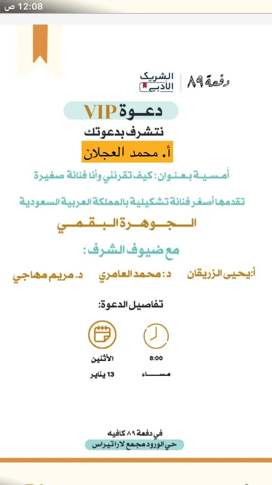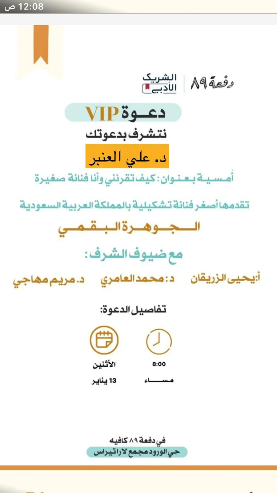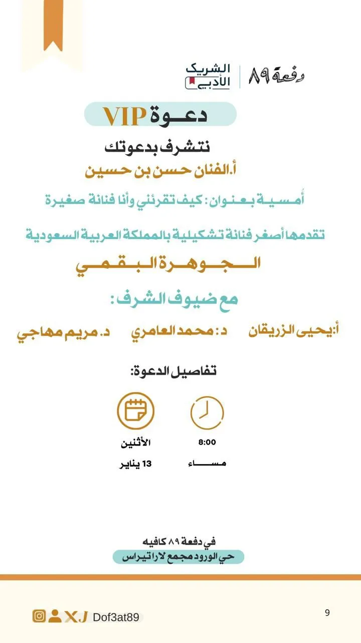 أمسية بعنوان : كيف تقرئني وأنا فنانة صغيرةتقدمها أصغر فنانة تشكيلية بالمملكة العربية السعوديةالجوهرة البقميمع ضيوف الشرف :أ: يحيى الزريقاند: محمد العامريد. مريم مهاجيتفاصيل الدعوةيوم الأثنين 13 ينايرالساعه8:00 مساء