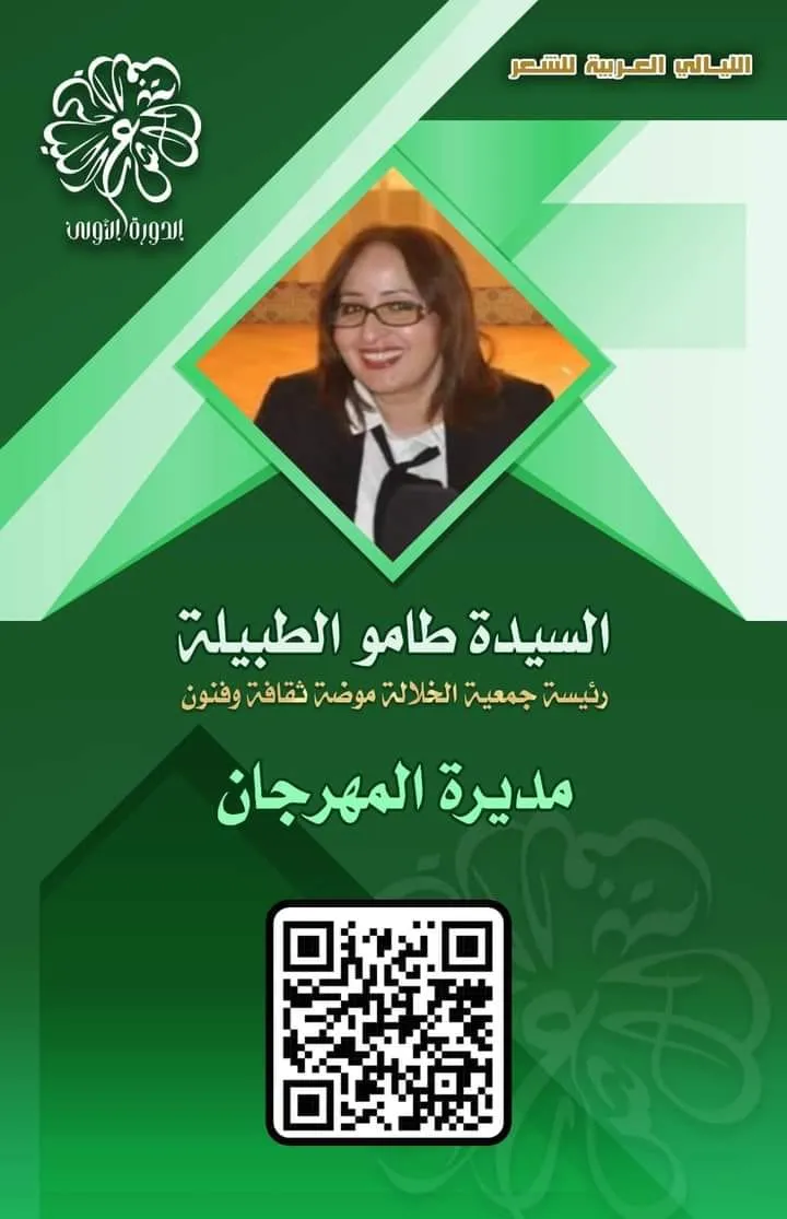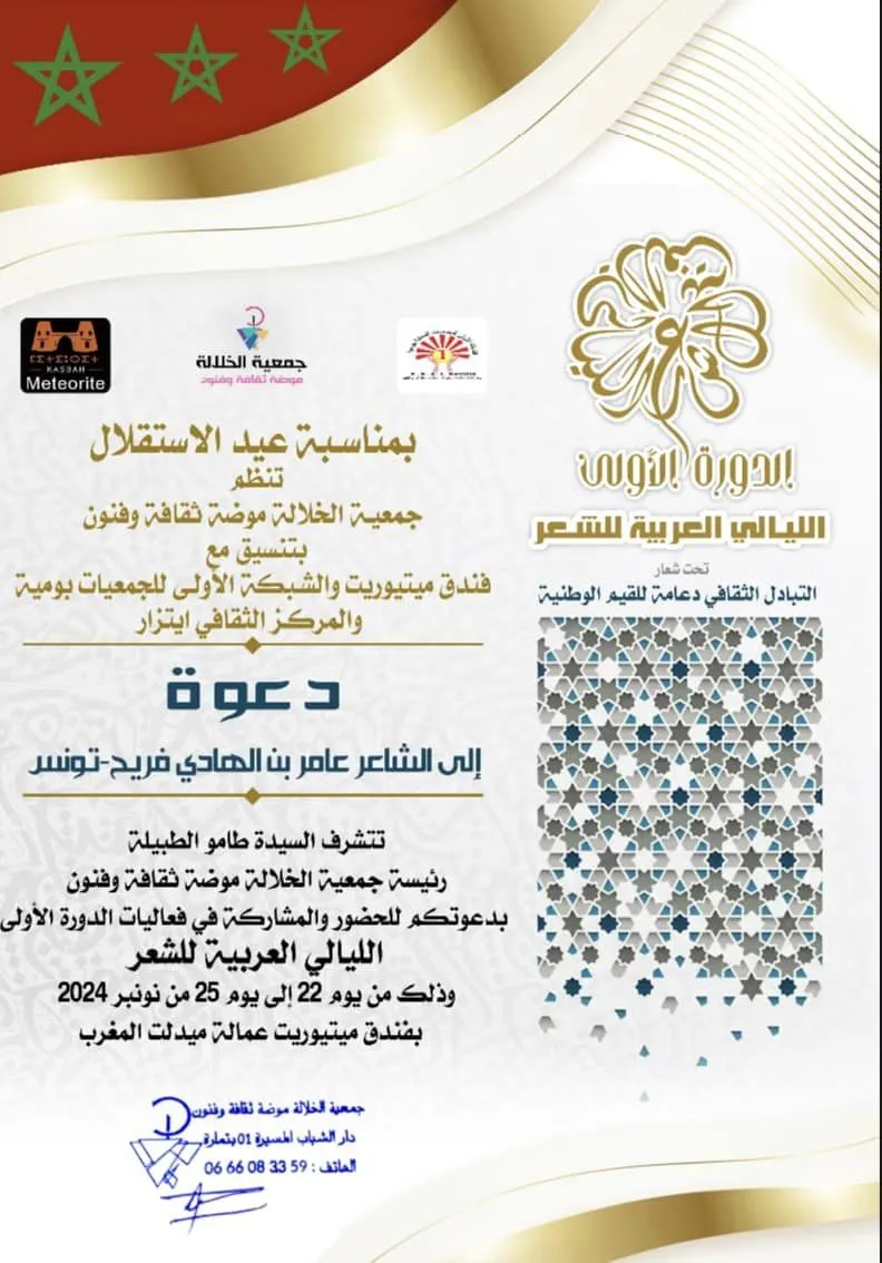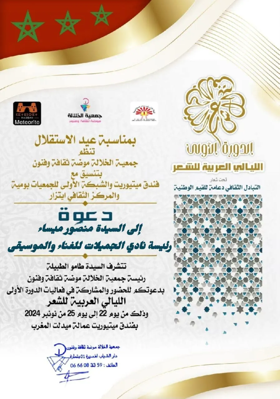 من تنظيم جمعية الخلالة موضة ثقافة وفنون وبشراكة مع الشبكة الأولى للجمعيات ببومية والمركز الثقافي ايتزار بفندق لميتيوريت بعمالة ميدلت ليالي الشعر العربية في درتها الأولى ستخلق الحدث بمشاركات دولية تونس سلطنة عمان العراق السعودية الامارات قطر سوريا وشواعر وطننا الحبيب الذي يزخر بالكفاءات الثقافية مرحبا بالجميع التكلفة 250 يورو تتضمن الاقامة كاملة لاربعة ايام ثلات ليالي والتنقل من والى المطار جولات سياحية للمدينة المهجورة وميبلادن مناجم الاحجار الكريمة الاتصال +212666083359