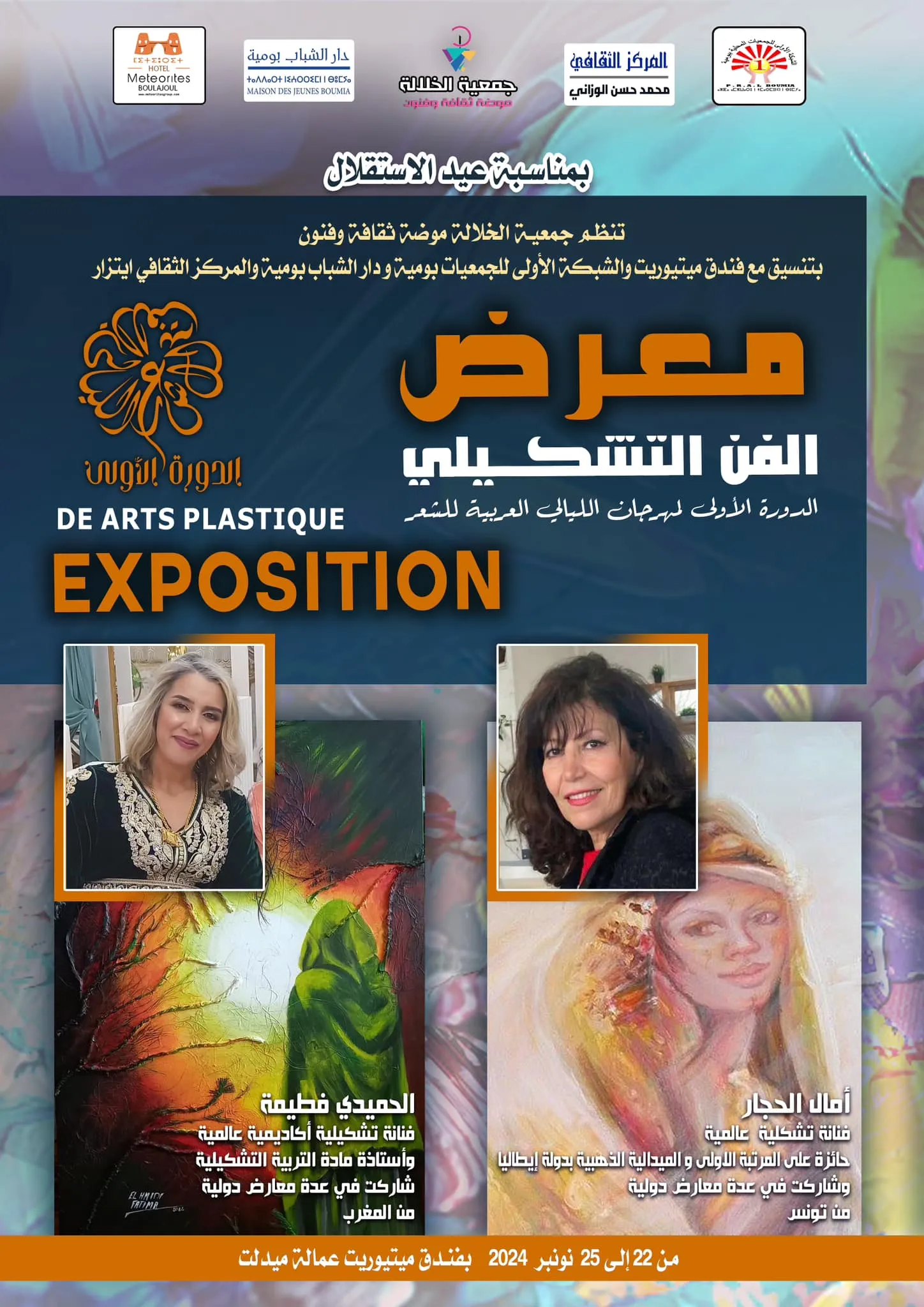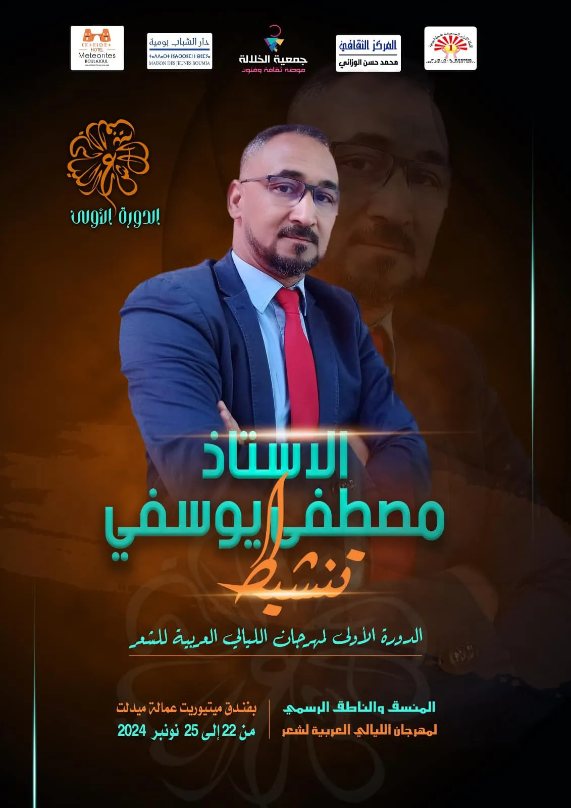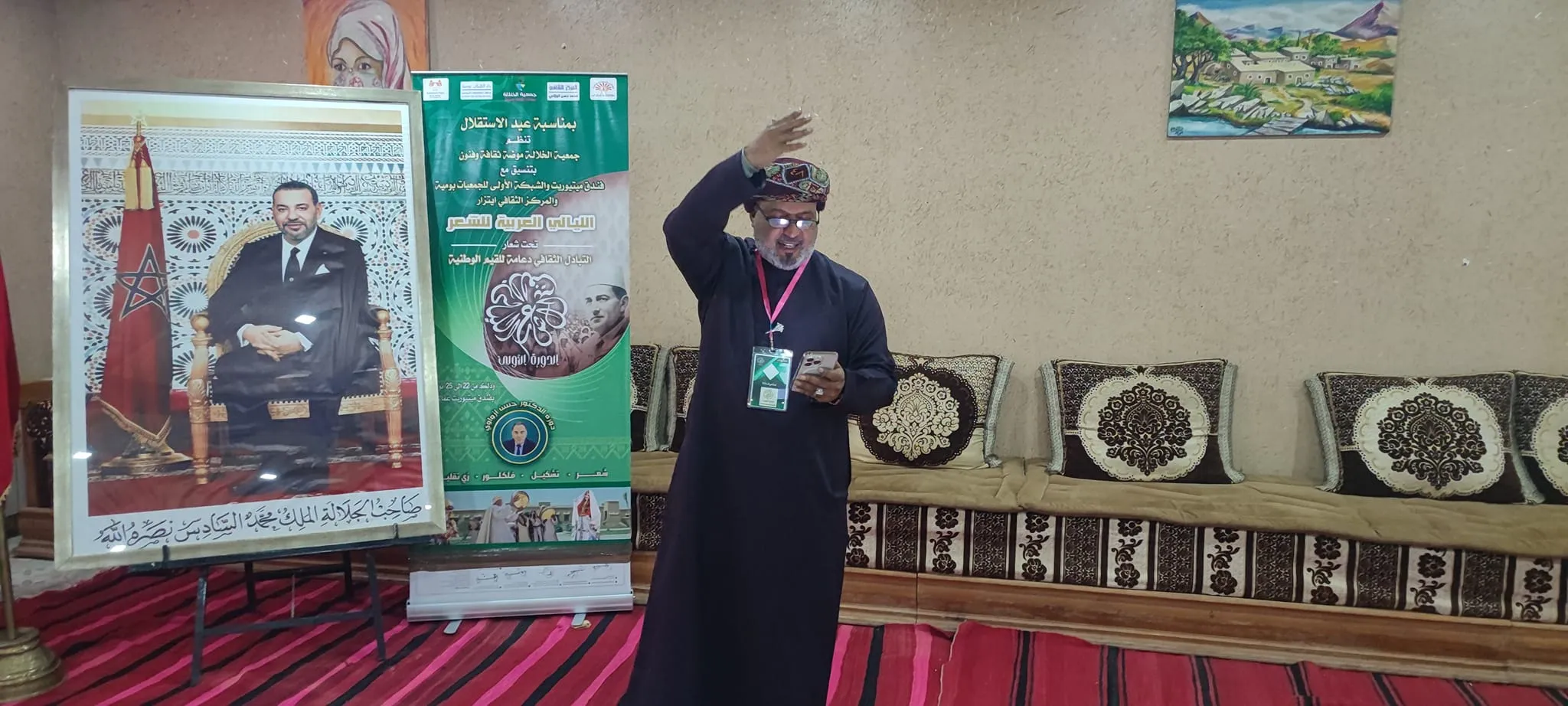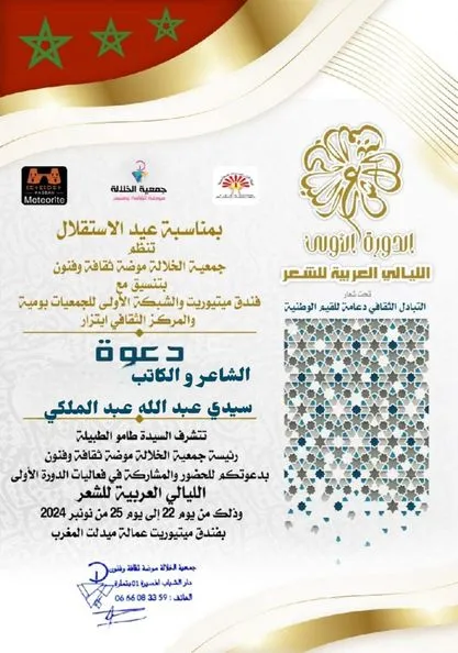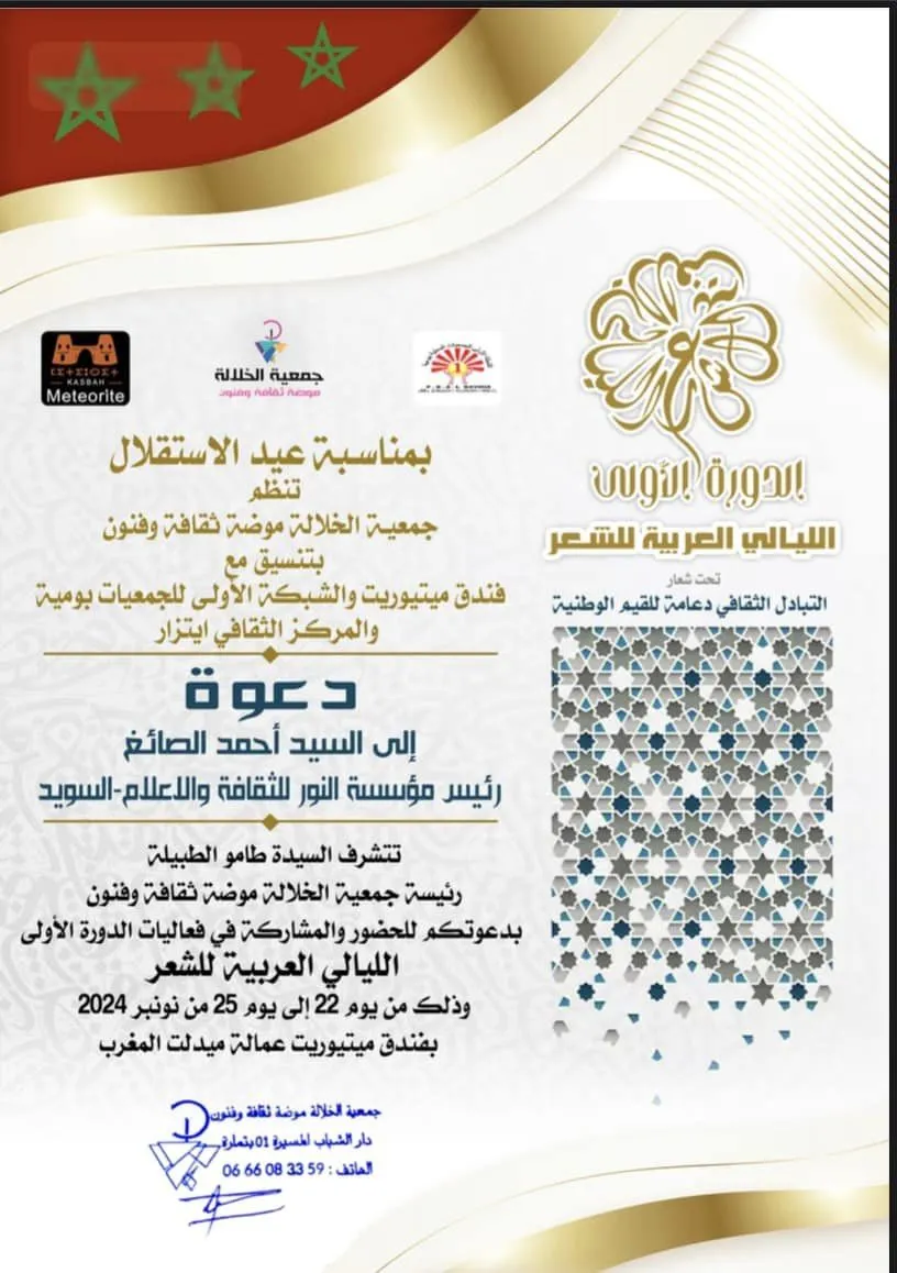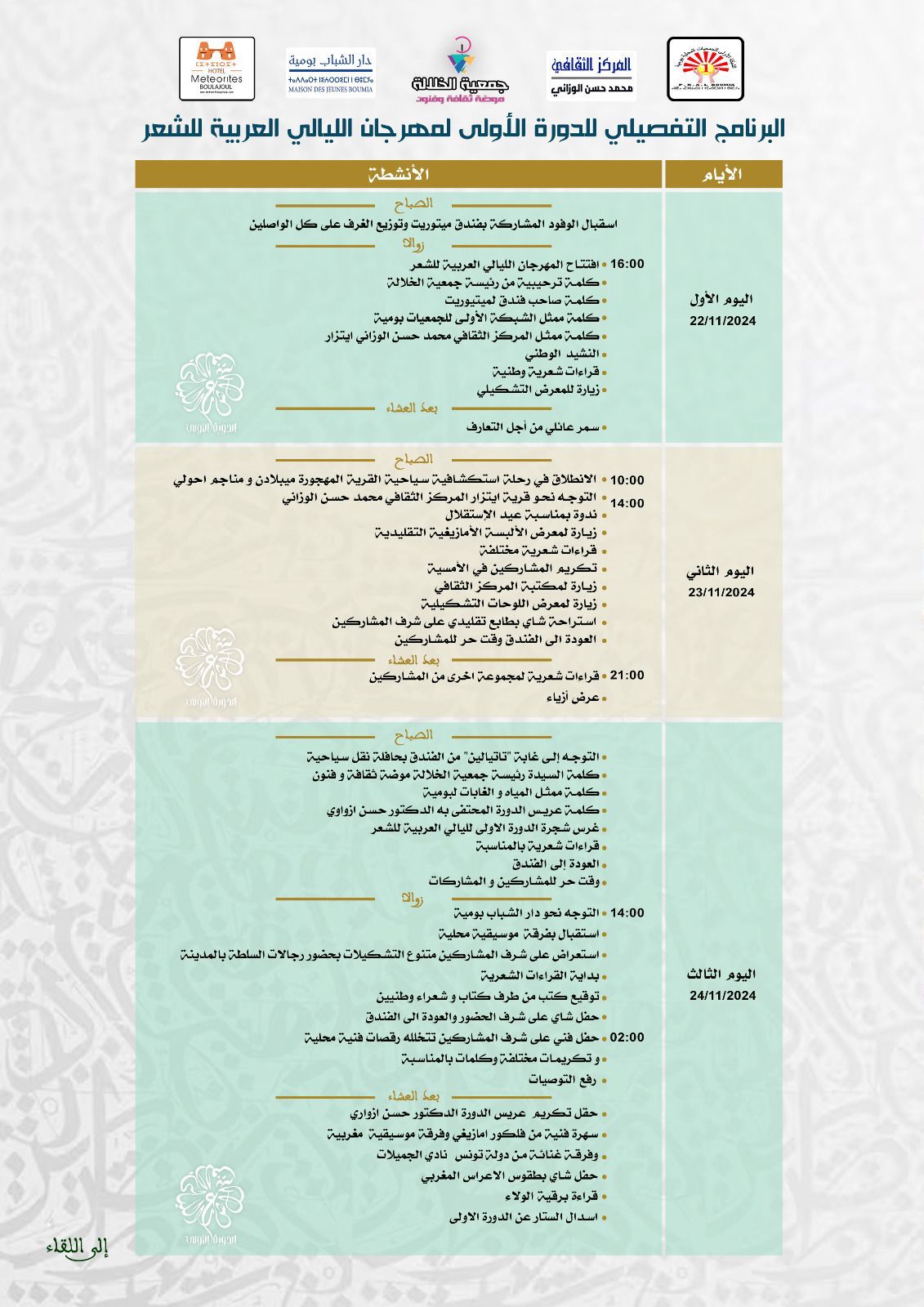 البرنامج التفصيلي للدورة الأولى لمهرجان الليالي العربية للشعر الأيام اليوم الأول 22/11/2024 الأنشطة الصباح اسقبال الوفود المشاركة بفندق ميتوريت وتوزيع الغرف على كل الواصلين 16:00 - افتتاح المهرجان الليالي العربية للشعر كلمة ترحيبية من رئيسة جمعية الخلالة كلمة صاحب فندق الميتيوريت كلمة ممثل الشبكة الأولى للجمعيات يومية كلمة ممثل المركز الثقافي محمد حسن الوزاني ايتزار النشيد الوطني قراءات شعرية وطنية زيارة للمعرض التشكيلي بعد العشاء سمر عائلي من أجل التعارف اليوم الثاني 23/11/2024 الصباح 10:00 - الانطلاق في رحلة استكشافية سياحية القرية المهجورة ميبلادن و مناجم احولي 14:00 - التوجه نحو قرية ابتزار المركز الثقافي محمد حسن الوزاني ندوة بمناسبة عيد الاستقلال زيارة لمعرض الألبسة الأمازيغية التقليدية قراءات شعرية مختلفة تكريم المشاركين في الأمسية زيارة المكتبة المركز الثقافي زيارة المعرض اللوحات التشكيلية استراحة شاي بطابع تقليدي على شرف المشاركين العودة الى الفندق وقت حر للمشاركين بعد العشاء 21:00 - قراءات شعرية لمجموعة اخرى من المشاركين عرض ازياء الصباح اليوم الثالث 24/11/2024 التوجه إلى غابة تاتيالين من الفندق بحافلة نقل سياحية - كلمة السيدة رئيسة جمعية الخلالة موضة ثقافة وفنون كلمة ممثل المياه والغابات اليومية كلمة عريس الدورة المحتفى به الدكتور حسن ازواوي غرس شجرة الدورة الأولى لليالي العربية للشعر قراءات شعرية بالمناسبة العودة إلى الفندق وقت حر للمشاركين والمشاركات 14:00 - التوجه نحو دار الشباب يومية استقبال بفرقة موسيقية محلية استعراض على شرف المشاركين متنوع التشكيلات بحضور رجالات السلطة بالمدينة بداية القراءات الشعرية توقيع كتب من طرف كتاب وشعراء وطنيين حفل شاي على شرف الحضور والعودة الى الفندق 02:00 - حفل فني على شرف المشاركين تتخلله رقصات فنية محلية و تكريمات مختلفة وكلمات بالمناسبة رفع التوصيات بعد العشاء . حقل تكريم عريس الدورة الدكتور حسن ازواري سهرة فنية من فتكور امازيغي وفرقة موسيقية مغربية وفرقة غنائة من دولة تونس نادي الجميلات حفل شاي بطقوس الأعراس المغربي قراءة برقية الولاء اسدال الستار عن الدورة الأولى
