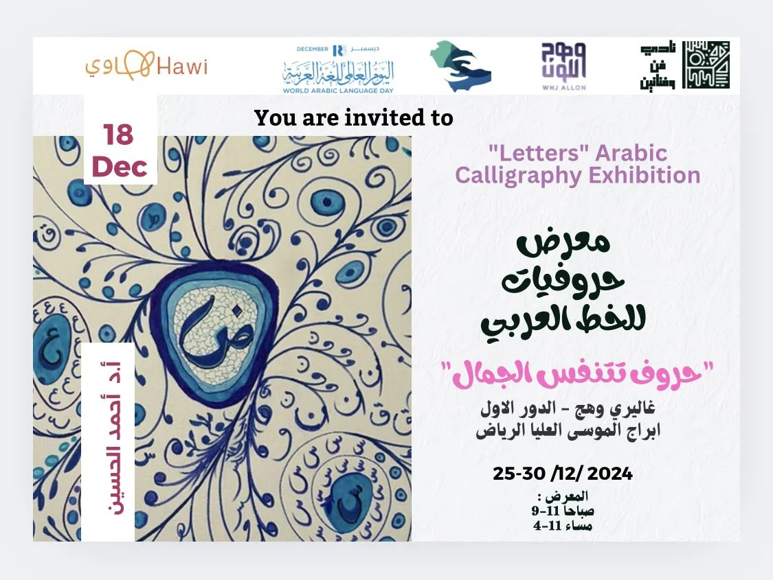 إحتفالاً بجمال لغتنا العربية، يسرنادي فن وفنانين بالتعاون مع غاليري وهج اللون دعوتكم لحضور إفتتاح معرض معرض حروفيات الخط العربي برعاية كريمة من رجل الأعمال والباحث في فلسفة الخط العربي والفنان التشكيلي الأستاذ محمد العجلان وذلك يوم الأربعاء الموافق 25 ديسمبر 2024 في تمام الساعة السابعة مساء سيكون هذا المعرض فرصة استثنائية لاستكشاف قدرة الفنان على التعامل مع الحرف العربي وفلسفته الفريدة، وفرصة تواصل نوعية لعشاق الخط العربي والفنون التشكيلية. . حضوركم يشرفنا ويثري الحدث . المكان : غاليري وهج اللون