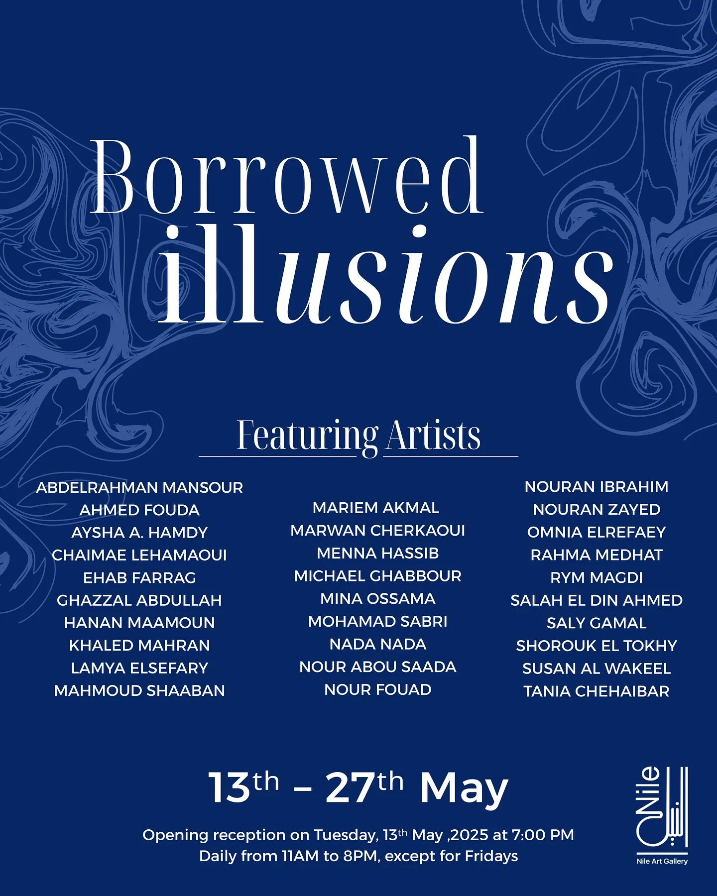 يتشرف جاليري النيل بدعوة سيادتكم لحضور افتتاح معرض بعنوان “أوهام مقترضة” وذلك في تمام الساعة السابعة مساء يوم الثلاثاء الموافق ١٣ مايو ٢٠٢٥، وتستمر فترة المعرض حتى يوم الثلاثاء الموافق ٢٧ مايو ٢٠٢٥.