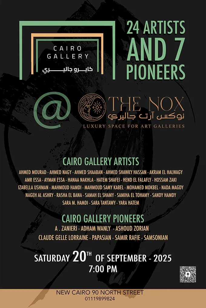 كايرو جاليري و نوكس آرت جاليري يتشرفان بدعوة سيادتكم لحضور افتتاح الموسم الفني الجديد بمعرض فني كبير يشارك فيه مجموعة مختارة من 24 فنان معاصر و7 فنانين من الرواد أحمد مراد - أحمد ناجي - أحمد شعبان - أحمد شوقي حسن - أكرم الحلوجي عمرو عيسى - أيمن عيسى - هناء نخلة - حاتم شافعي - هند الفلافلي- حسام ذكي إيزابيلا اوشمان- محمود حمدي - محمود سامي قابيل - محمد مقبل - ندى مجدي ناجح العشري - رشا البنا - سماح الشامي - سميحة التهامي - ساندي حمدي سارة م. حمدي - سارة طنطاوي - يارا حاتم الرواد : أ. زانييري - أدهم وانلي - أشود زوريان كلود جيليه لورين - بابازيان - سمير رافع - سامسونيان يوم السبت القادم الموافق 20 سبتمبر 2025 في تمام الساعة 7 مساء ... وجودكم يشرفنا ويسعدنا