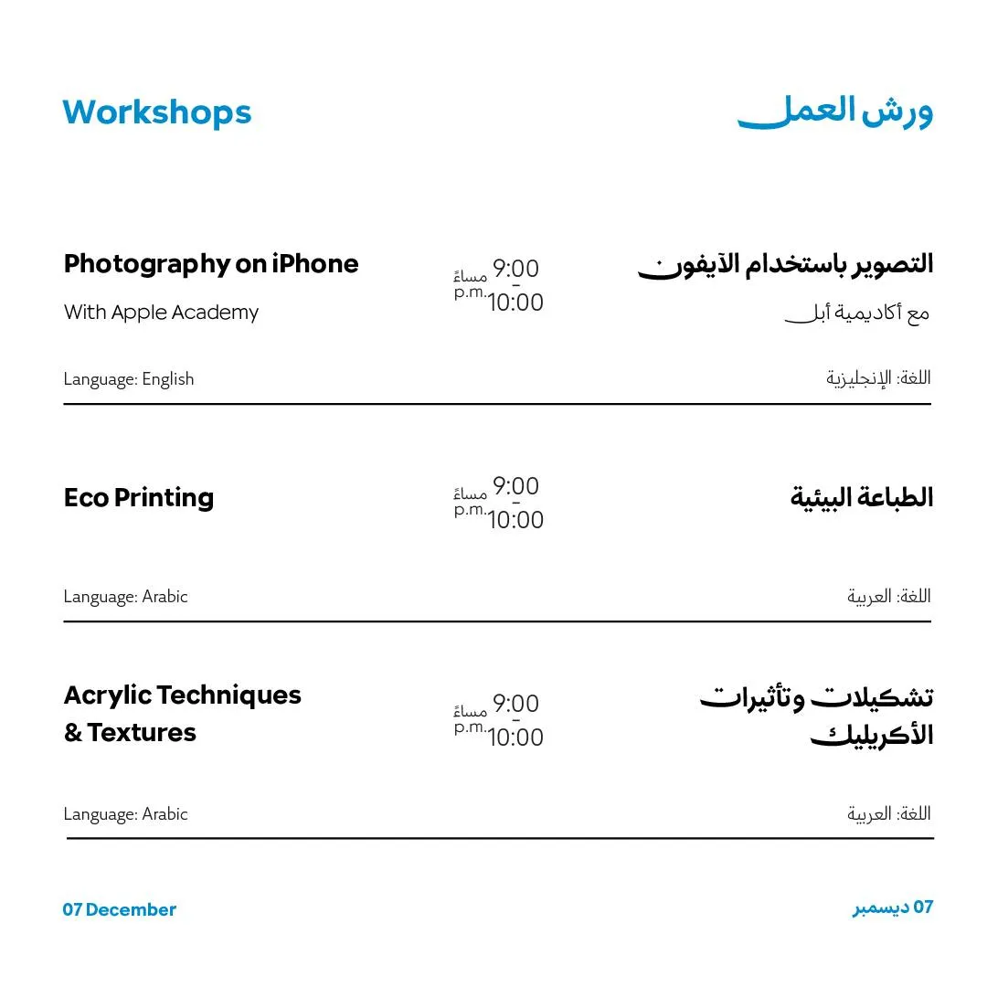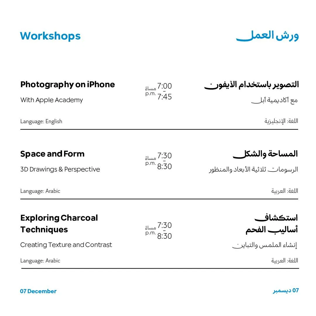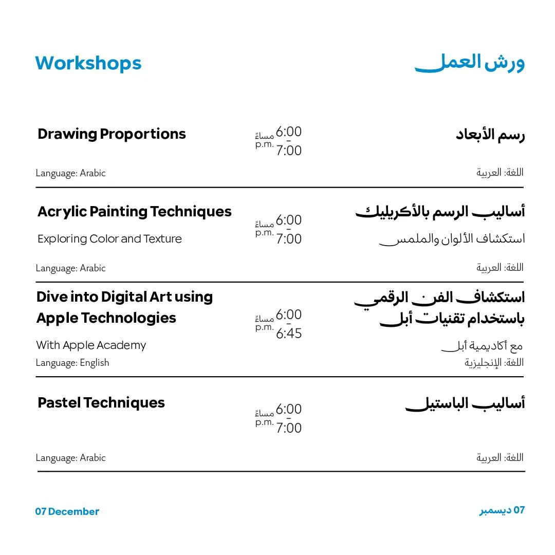 نرحب بدخول الصغار في أسبوع مسك للفنون فقط في 5 ،و6و7 ديسمبر وفي الأيام المتبقية، سيقتصر الدخول علي البالغين الذين تزيد أعمارهم عن 16 عاماً فقط.