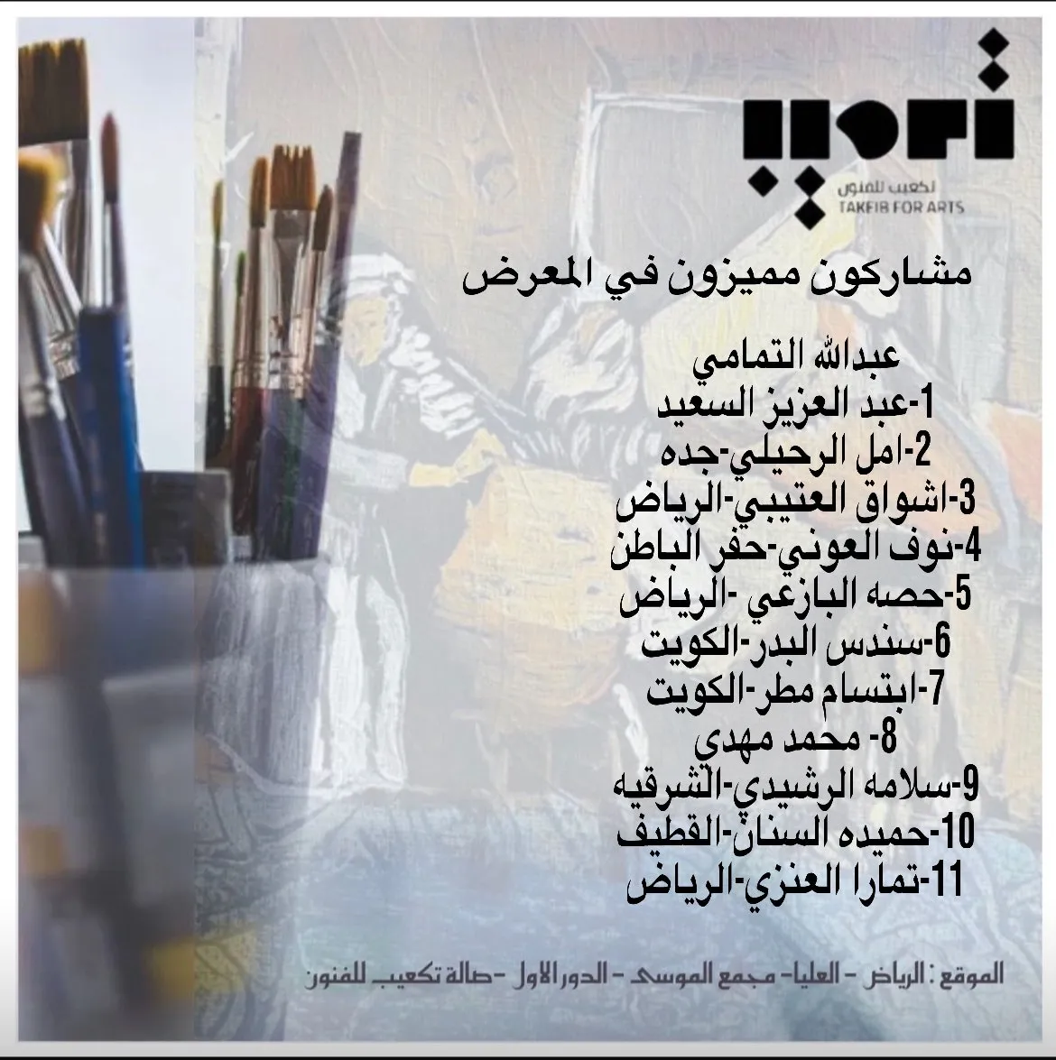 بمشاركة كوكبة من نجوم الفن السعودي والخليجي منهم ا.عبدالعزيز السعيد -مها السبحي-حميدة السنان -سندس البدر -ابتسام مطر من الكويت -امل الرحيلي - تمار العنزي - حصه البازعي - محمد مهدي- اشواق العتيبي- سلامه الرشيد- وتشكر تكعيب للفنون ممثلة في الفنان عبدالله التمامي وجميع الفانين المشاركين في المعرض/د.منال الرويشد على رعايتها للمعرض وجميع من حضر من الإعلاميين والفنانين والمهتمين بالفنون