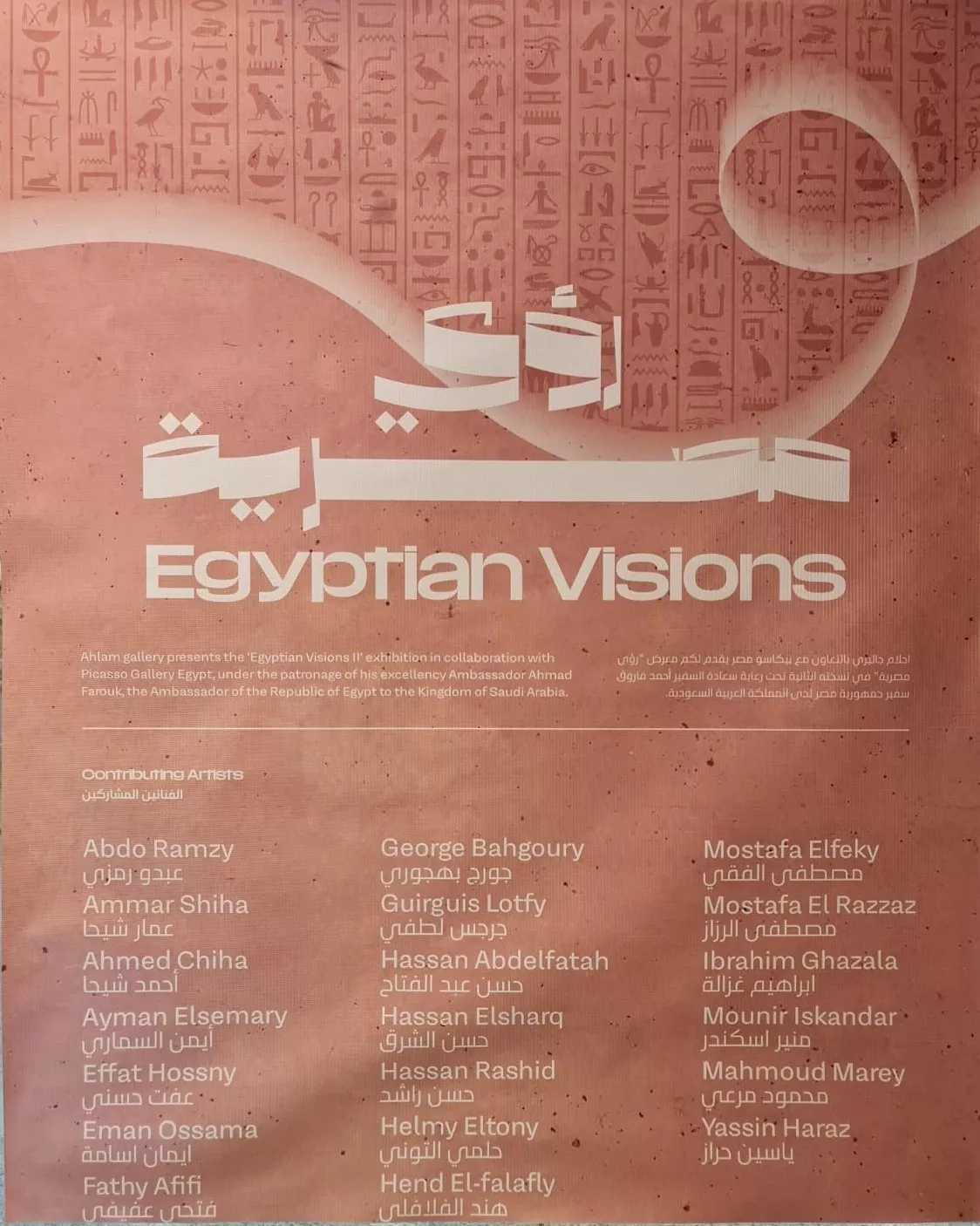 احلام جاليري ، مجمع الموسى للفنون ، العليا الرياض بالتعاون مع بيكاسومصر لكم معرض رؤي مصرية في نسختة الثانية تحت رعاية سعادة السفير أحمد فاروق سفير جمهورية مصر العربية لدي اللمملكة العربية السعودية مصطفى الفقي - مصطفى الرزاز - ابراهيم غزالة - منير اسكندر- محمود مرعي - ياسين حراز - جورج بهجوري - جرجس لطفي - حسن عبدالفتاح - حسن الشرق - حسن راشد - حلمي التوني - هند الفلافلي - عبدو رمزي - عمار شيحا - أحمد شيحا - أيمن السماري - عفت حسني - أيمان اسامة