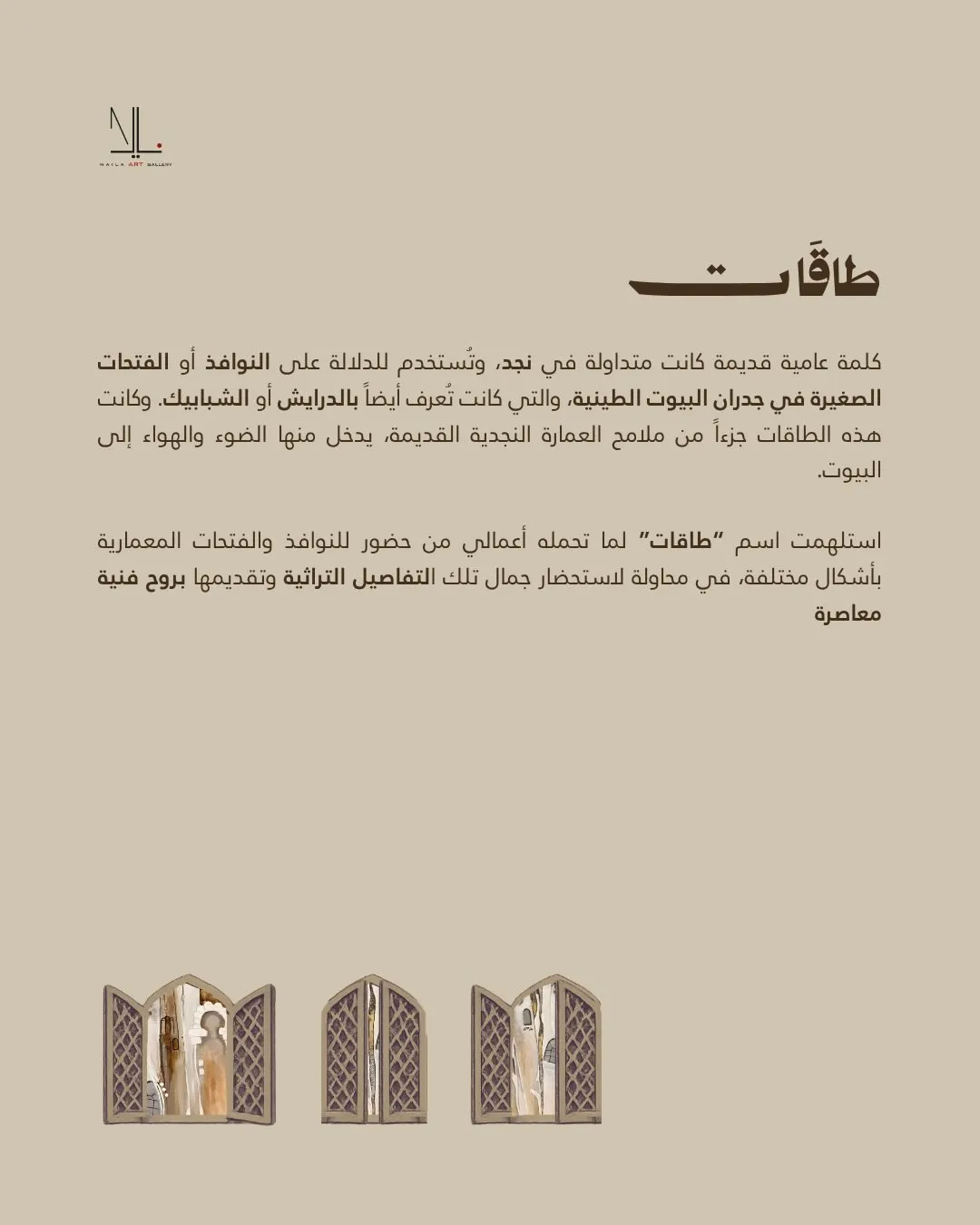 طاقات كلمة عامية قديمة كانت متداولة في نجد وتستخدم للدلالة على النوافذ أو الفتحات الصغيرة في جدران البيوت الطينية، والتي كانت تعرف أيضاً بالدرايش أو الشبابيك. وكانت هذه الطاقات جزءاً من ملامح العمارة النجدية القديمة، يدخل منها الضوء والهواء إلى البيوت. استلهمت اسم "طاقات" لما تحمله أعمالي من حضور للنوافذ والفتحات المعمارية بأشكال مختلفة، في محاولة لاستحضار جمال تلك التفاصيل التراثية وتقديمها بروح فنية معاصرة