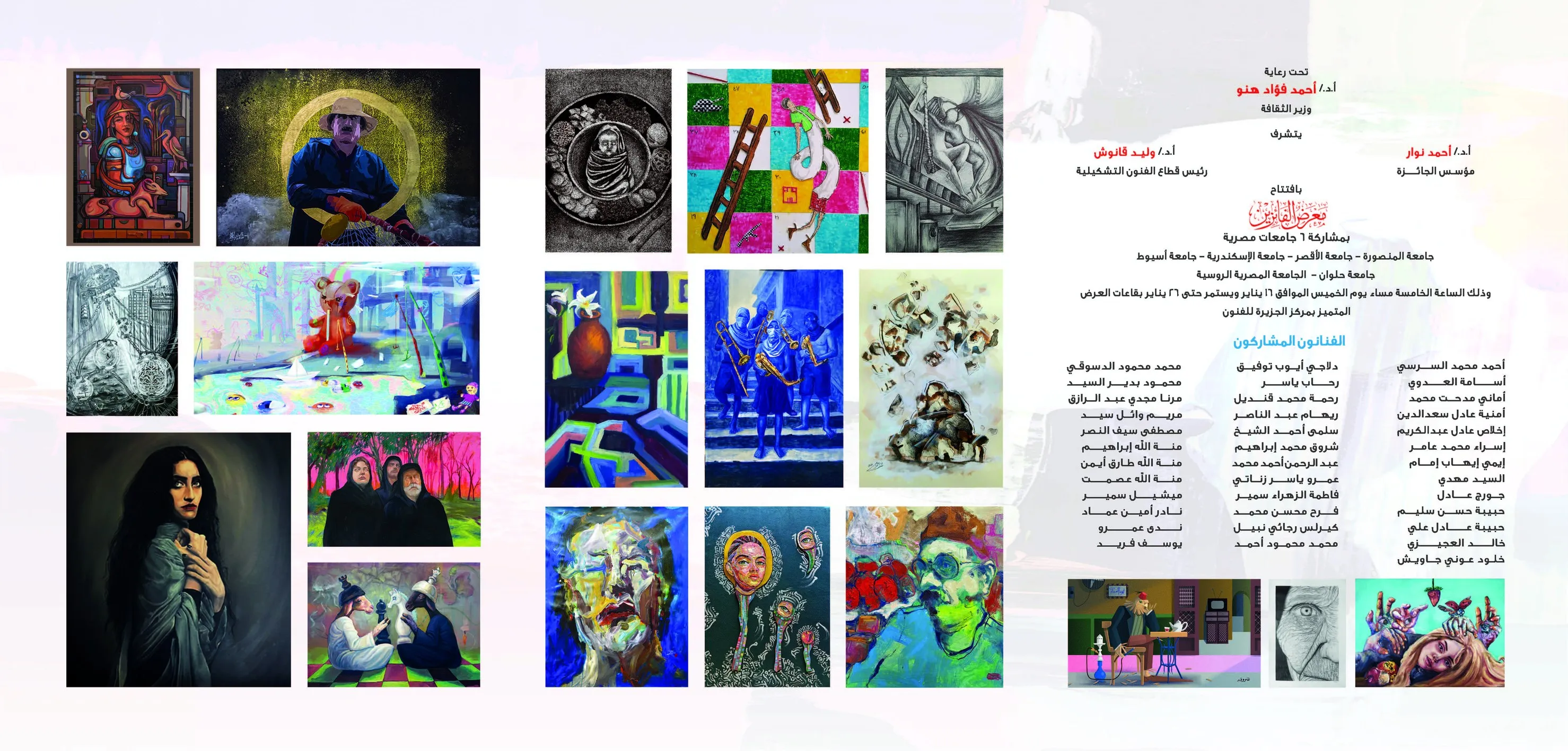 افتتاح معرض "الفائزين" بجائزة نوار للرسم بمركز الجزيرة للفنون افتتح أ.د/ وليد قانوش رئيس قطاع الفنون التشكيلية معرض "الفائزين" بجائزة نوار للرسم رافقه أ.د/ أحمد نوار مؤسس الجائزة والفنان/ أحمد رجب صقر قومسير المعرض ونخبة من الفنانين التشكيليين وبمشاركة 6 جامعات مصرية (جامعة المنصورة – جامعة الأقصر – جامعة الإسكندرية – جامعة أسيوط – جامعة حلوان – الجامعة المصرية الروسية). بقاعات العرض المتميز بمركز الجزيرة للفنون وذلك يوم الخميس 16 يناير 2025. يستمر المعرض حتى 26 يناير 2025. الدخول مجاناً يسعدنا تشريفكم المواعيد: يومياً من الساعة 9 صباحاً : الساعة 9 مساءً عدا يوم الجمعة. العنوان: 1 ش الشيخ المرصفي بالزمالك بجوار فندق ماريوت القاهرة. ت: 0227373298 #قطاع_الفنون_التشكيلية